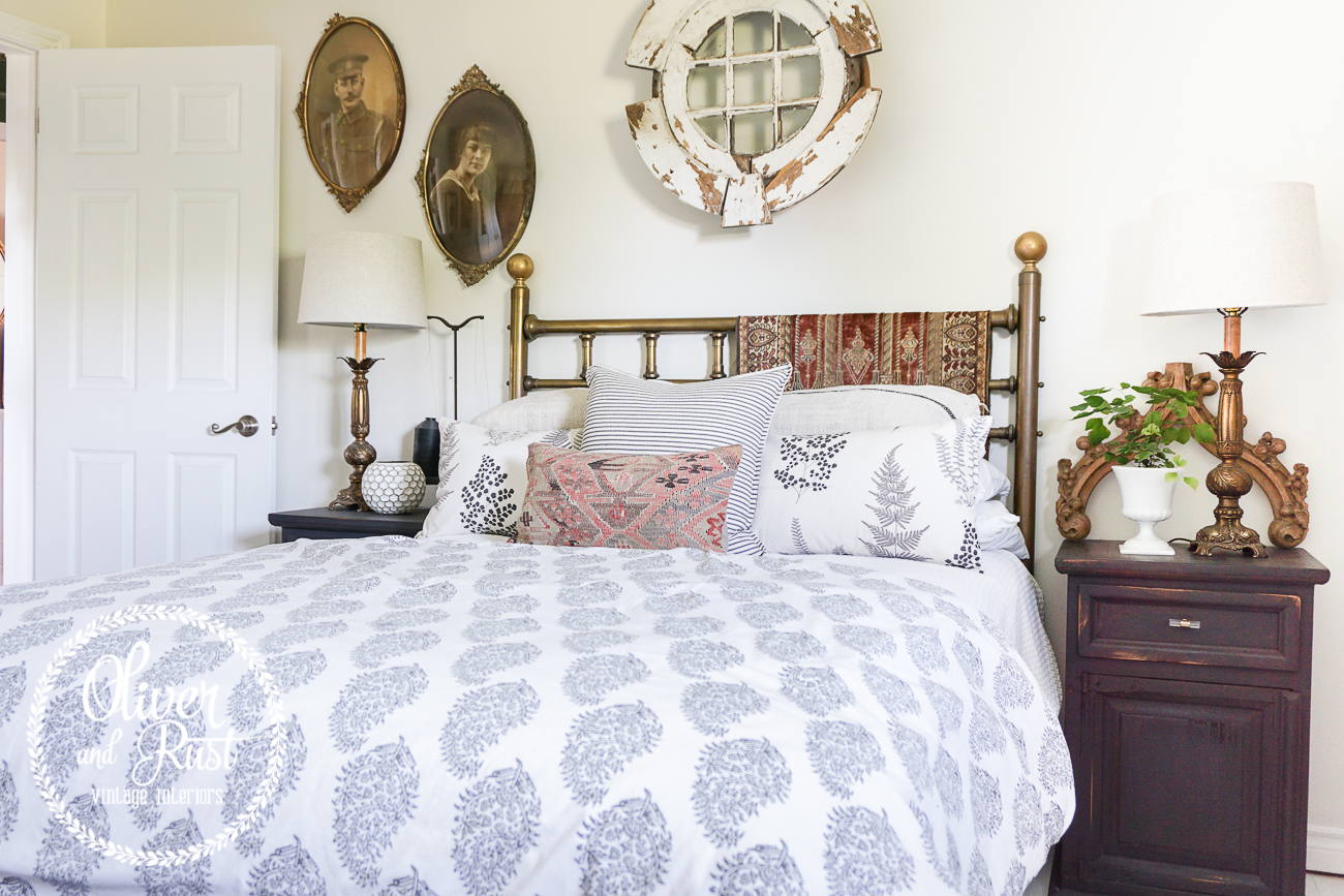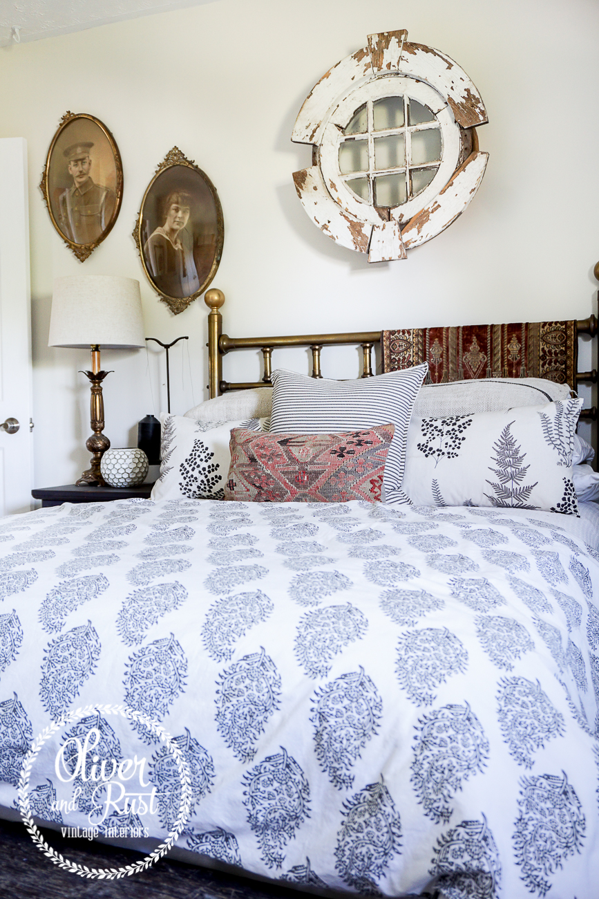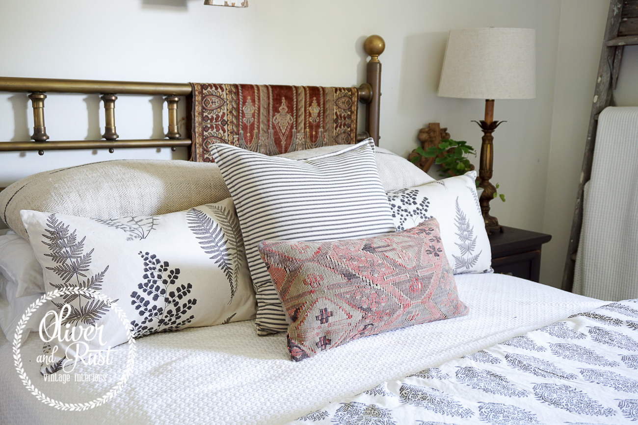 for a few of the newer followers. i made the botanical art with pressed leaves from around our property about 4 years ago. the duvet cover was west elm about 6 years ago and is usually in our room but it looks so nice with the fern pillows and kilim pillow i added that it gets to live in here now. i added the white honeycomb looking candle holder that is the perfect size to just sit without needed anything inside or being too small to be a place holder.