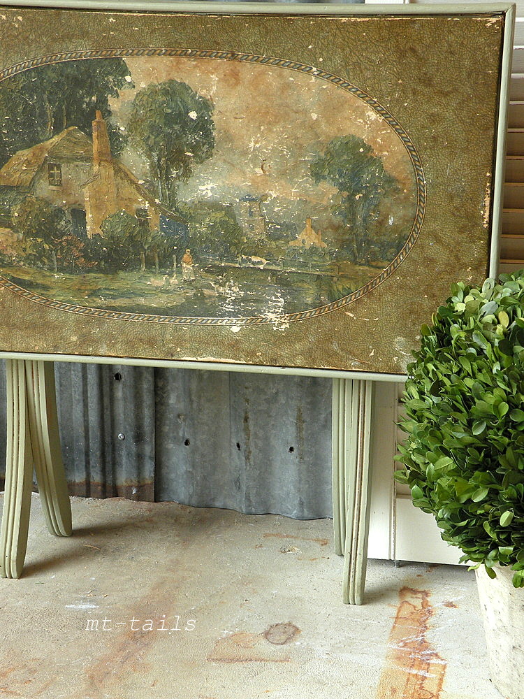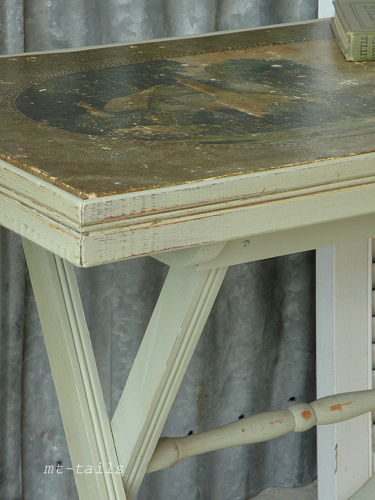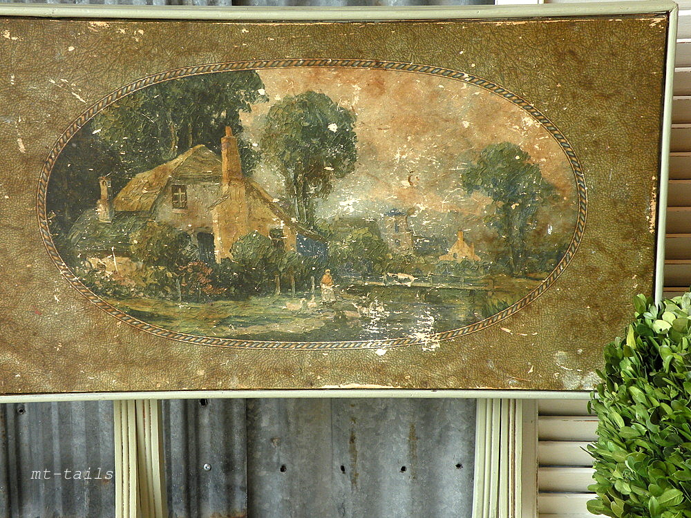 the top of this table is a type of paper with age and wear spots that make it look like a tapestry. the sweetest cottage and woman out by her pond. i have lightly waxed the top to stop further wear and preserve the age it acquired.