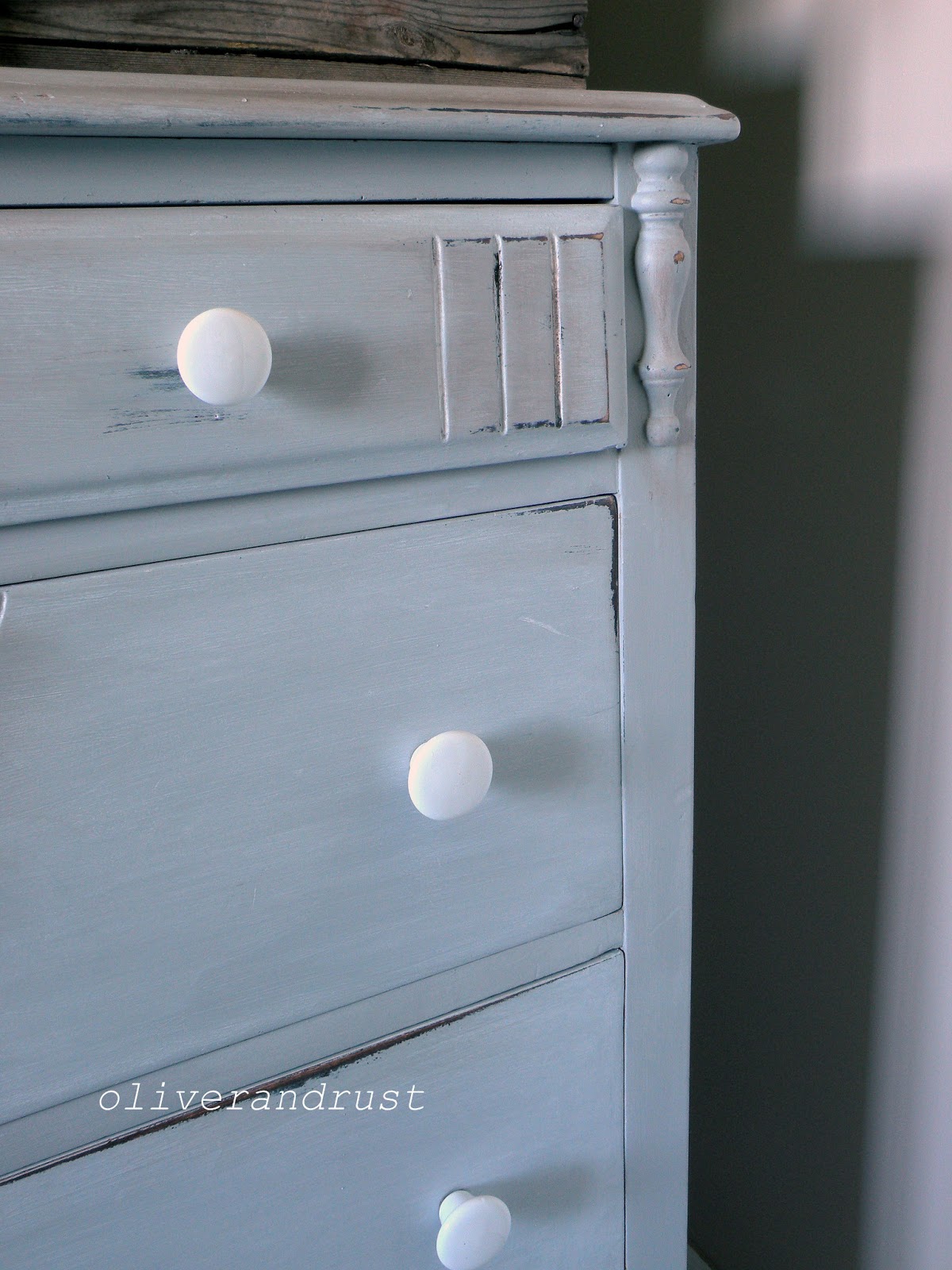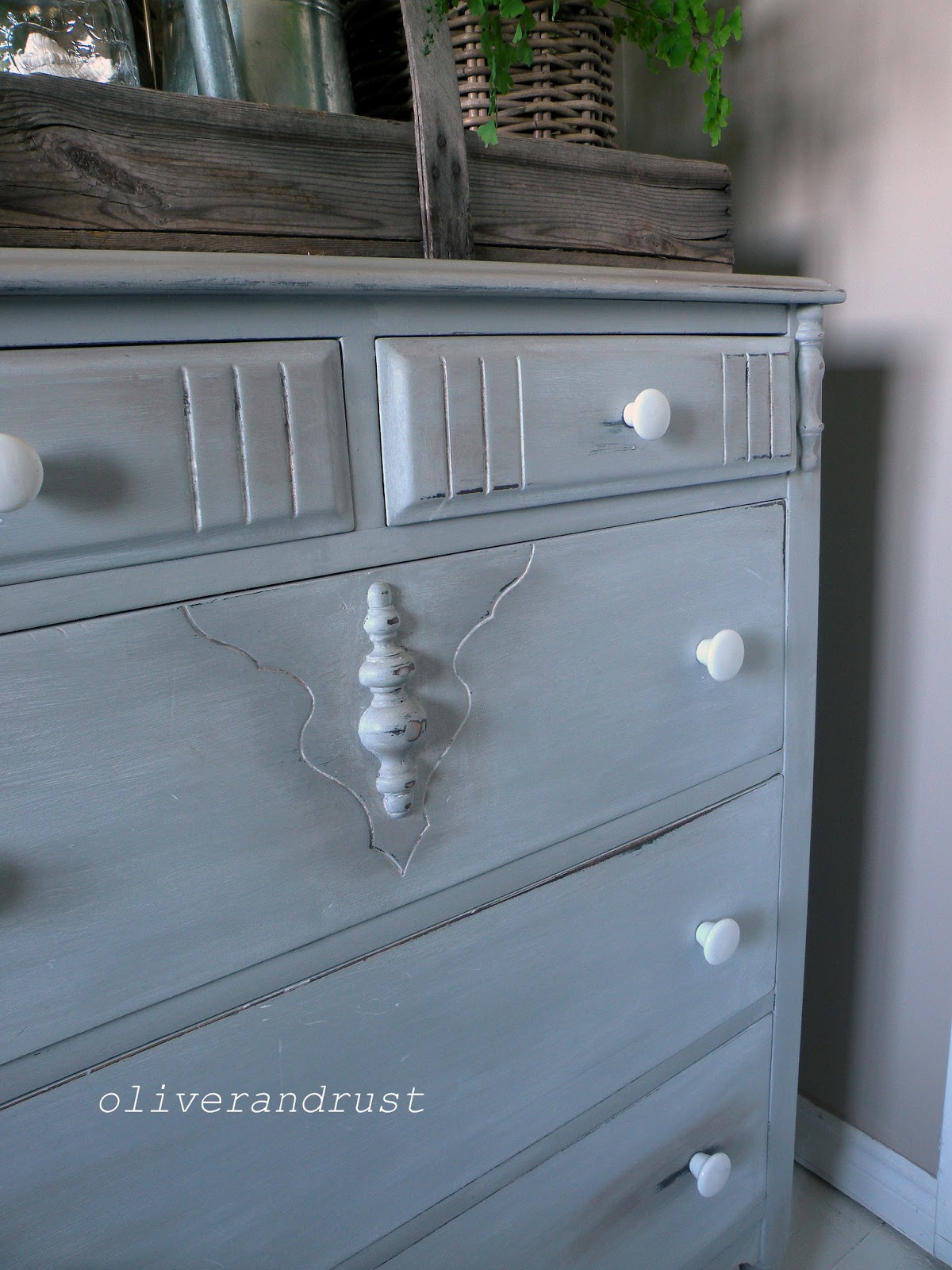 I refinished this dresser in Annie Sloan paris grey and added white milk glass knobs.