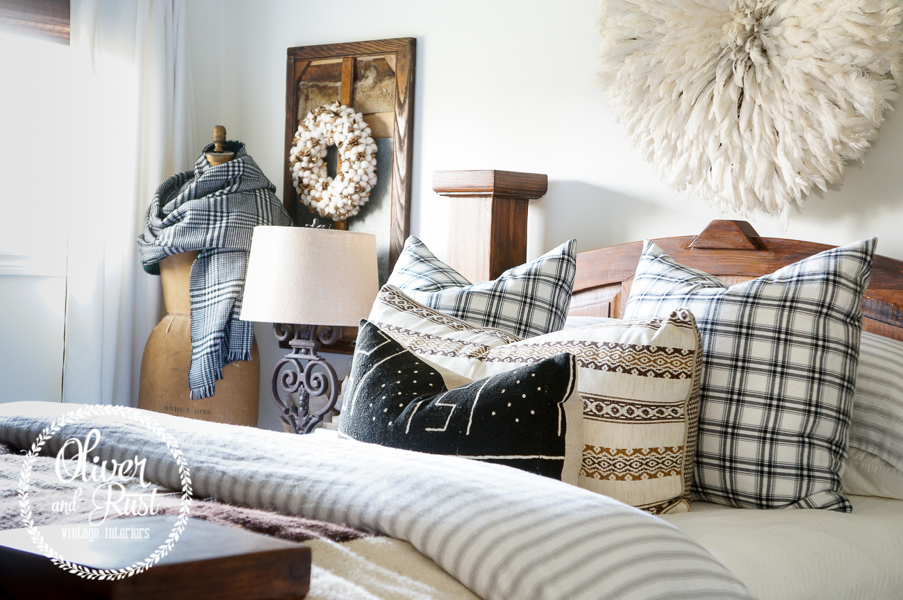 the front lumbar pillow is vintage african mud cloth with linen.