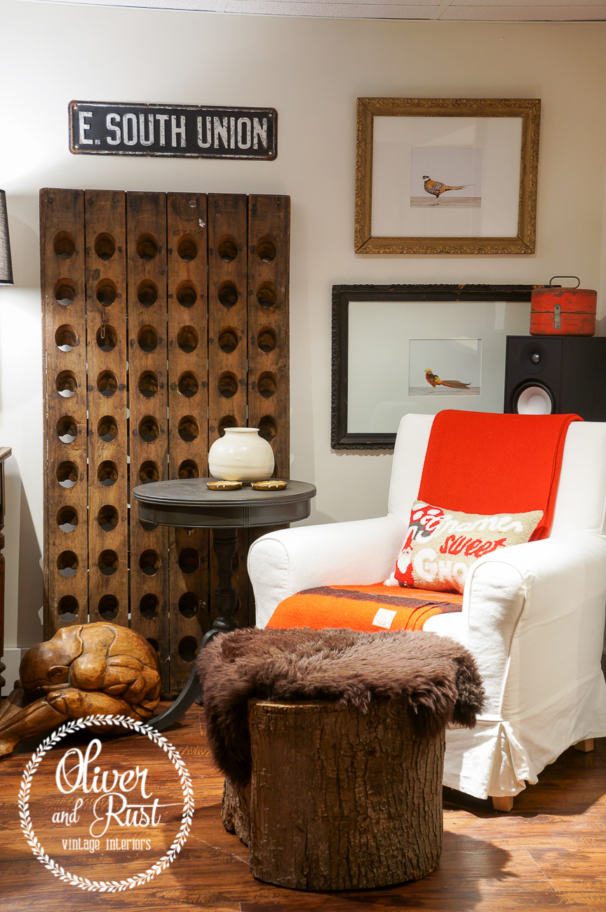 you can catch a glimpse beyond the club chair of our record rack. the rack is one from an old record store. i found the rack on etsy and the seller was awesome and even delivered it to the shop.