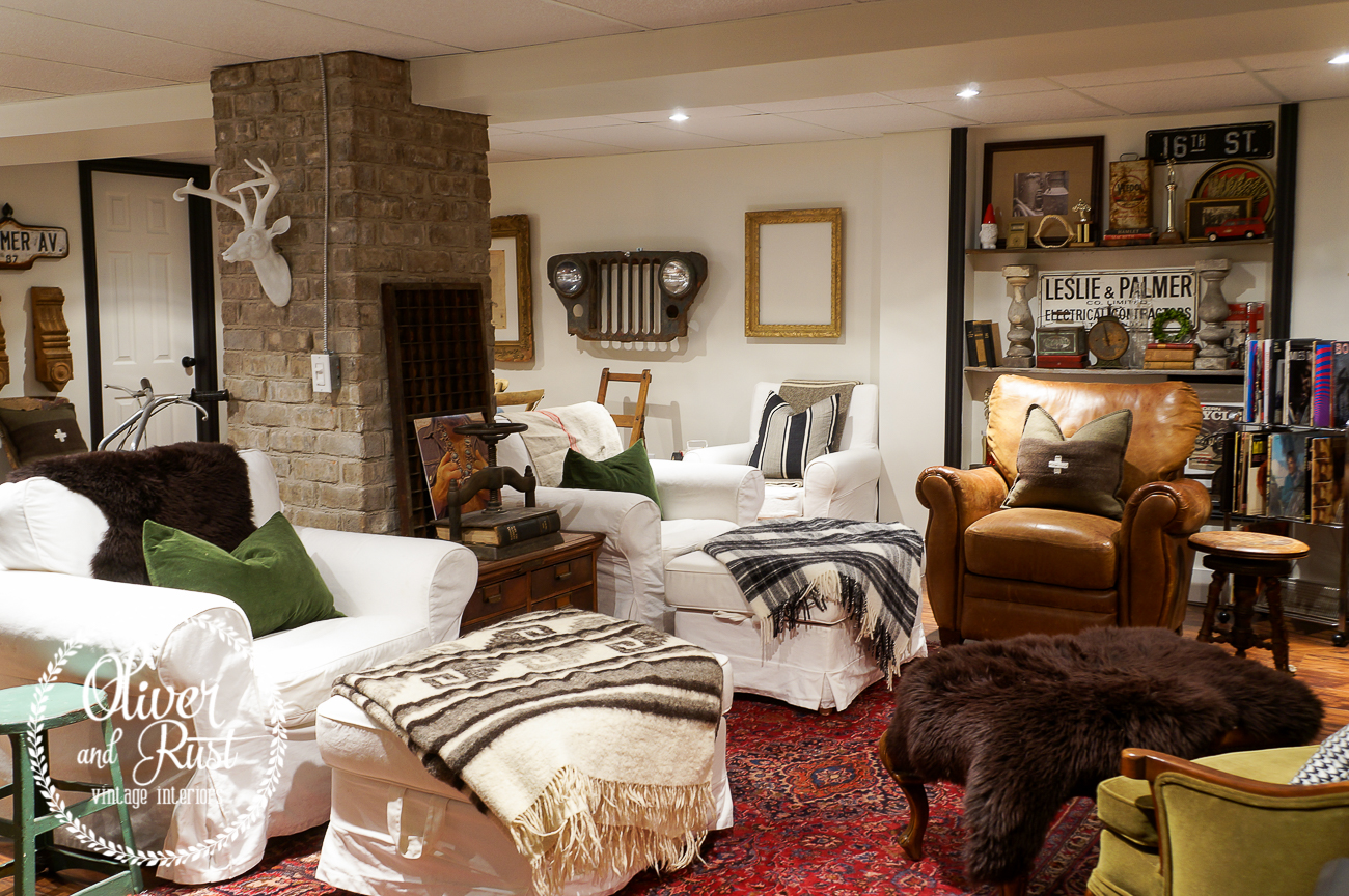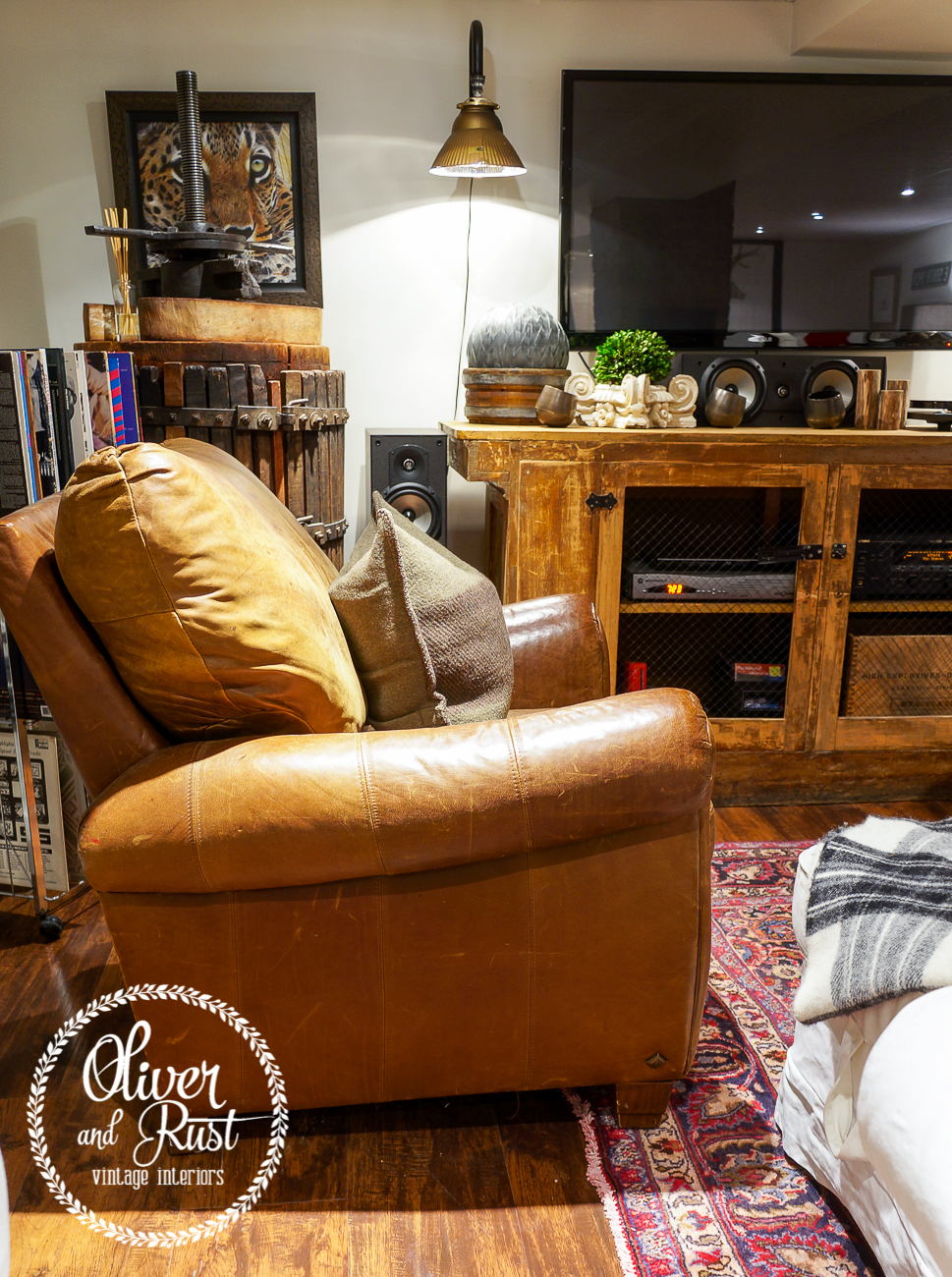 The leather club chair that is down here is one of a pair that lives in our upstairs and when I find another to replace it up there, the one upstairs will come live down here to have everything paired up.