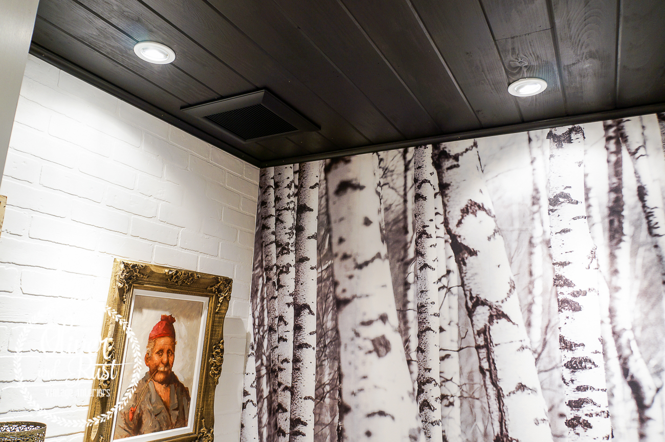 A shot of the ceiling detail. We used plain pine tongue and groove and painted it black instead of traditional white. Just something to add that extra touch of luxury to an otherwise industrial space. In case someone is curious it is Sherwin Williams Black Magic (same as our basement hallway and trim)