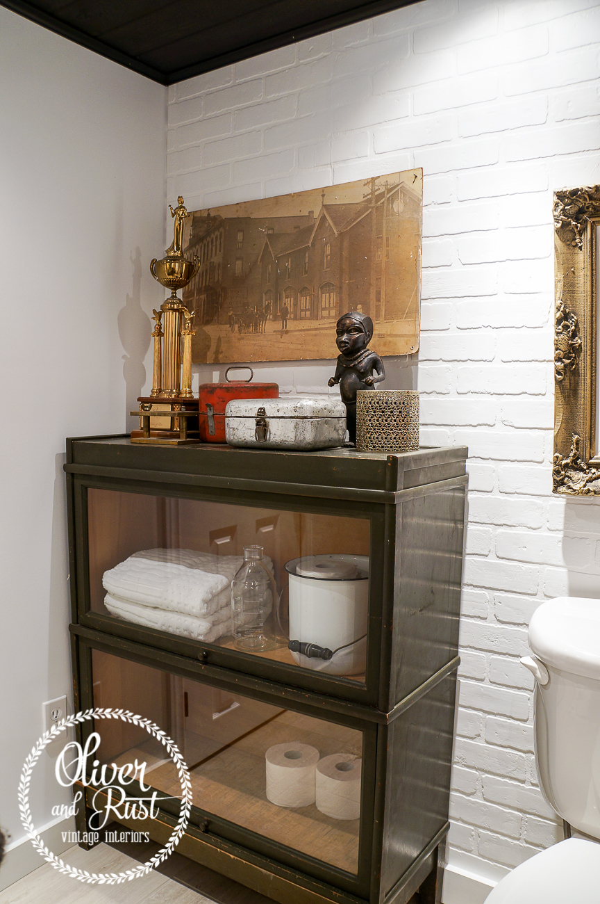 We don't need a lot of storage in this bathroom as it is only a 2 piece but we found this old army barrister cabinet in olive green that we've had stashed for about 2 years as it fits perfectly behind the door. A great place for a few collectibles and toilet paper.