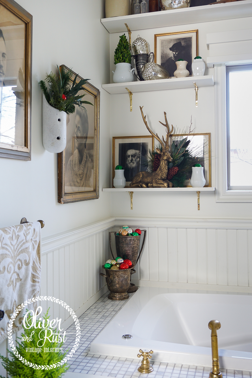 the bathroom doesn't get a ton of changes. just a few change outs on the shelves, couple of antique ornaments piled in urns and a cypress tree. festive and clean.