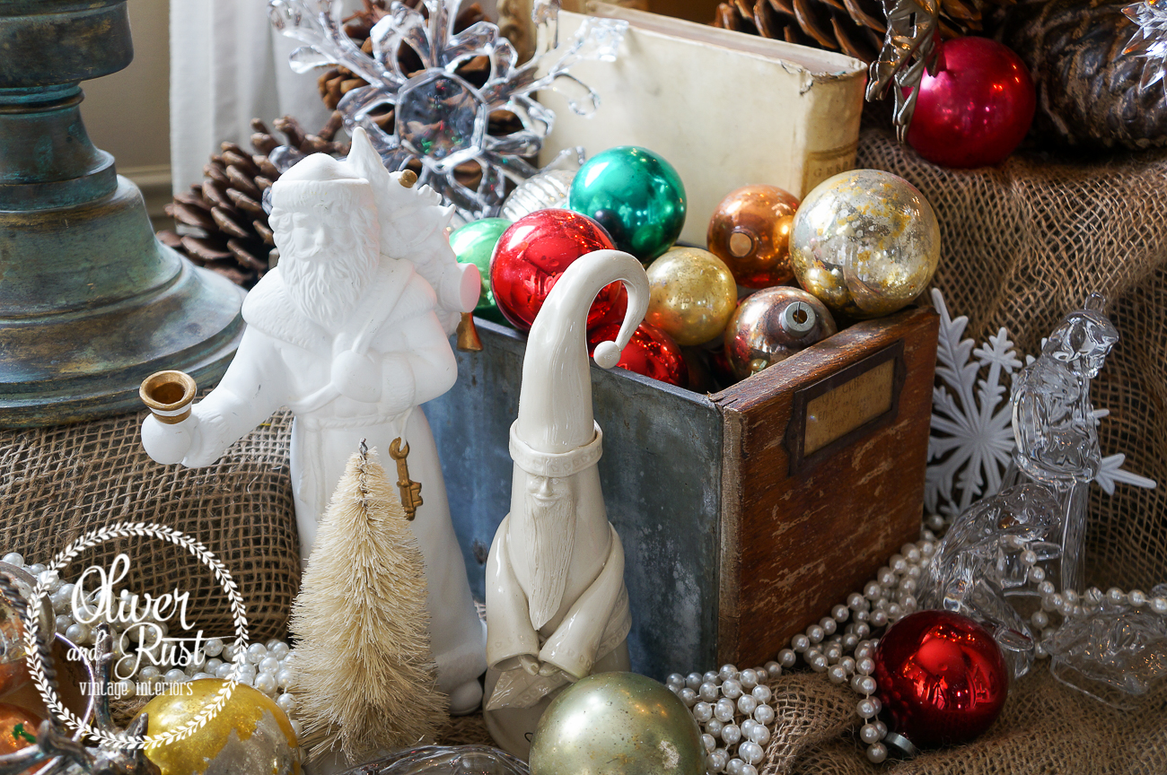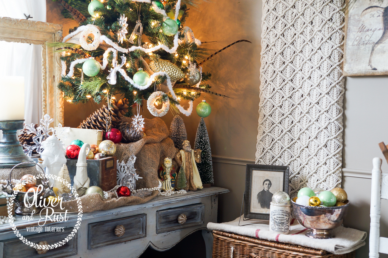 i really love this little tree in our upstairs hallway. it has many ornaments on it we found in new york city last year and tons of vintage goodies. the light when coming up the stairs at night is so pretty and this table vignette just makes me smile
