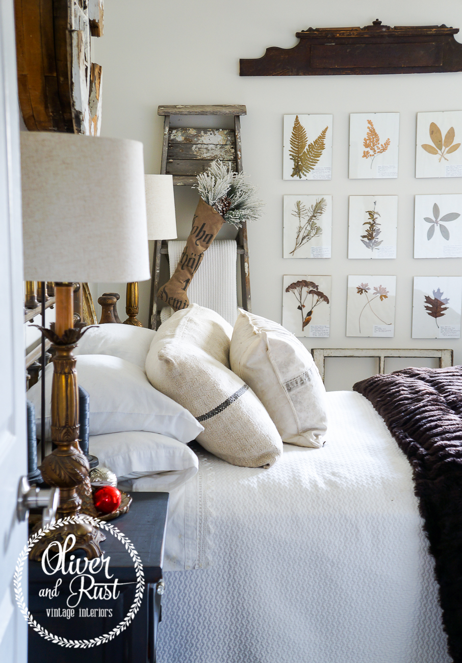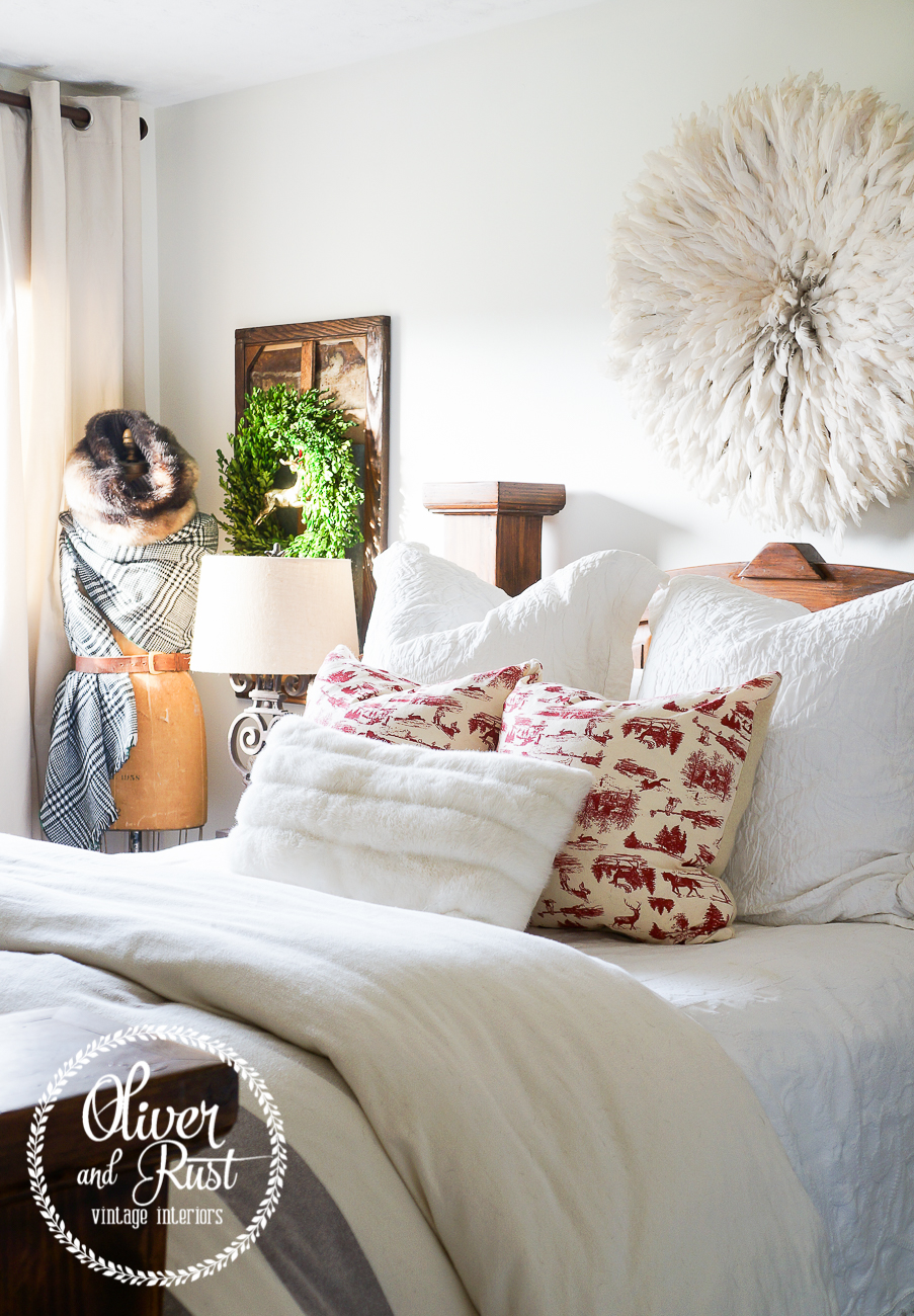 and in our room i brought back the red i tried out last year. the classic holiday toile pillows are ones i made for the shop. my home ones i changed up a bit by adding cream wool to the back.