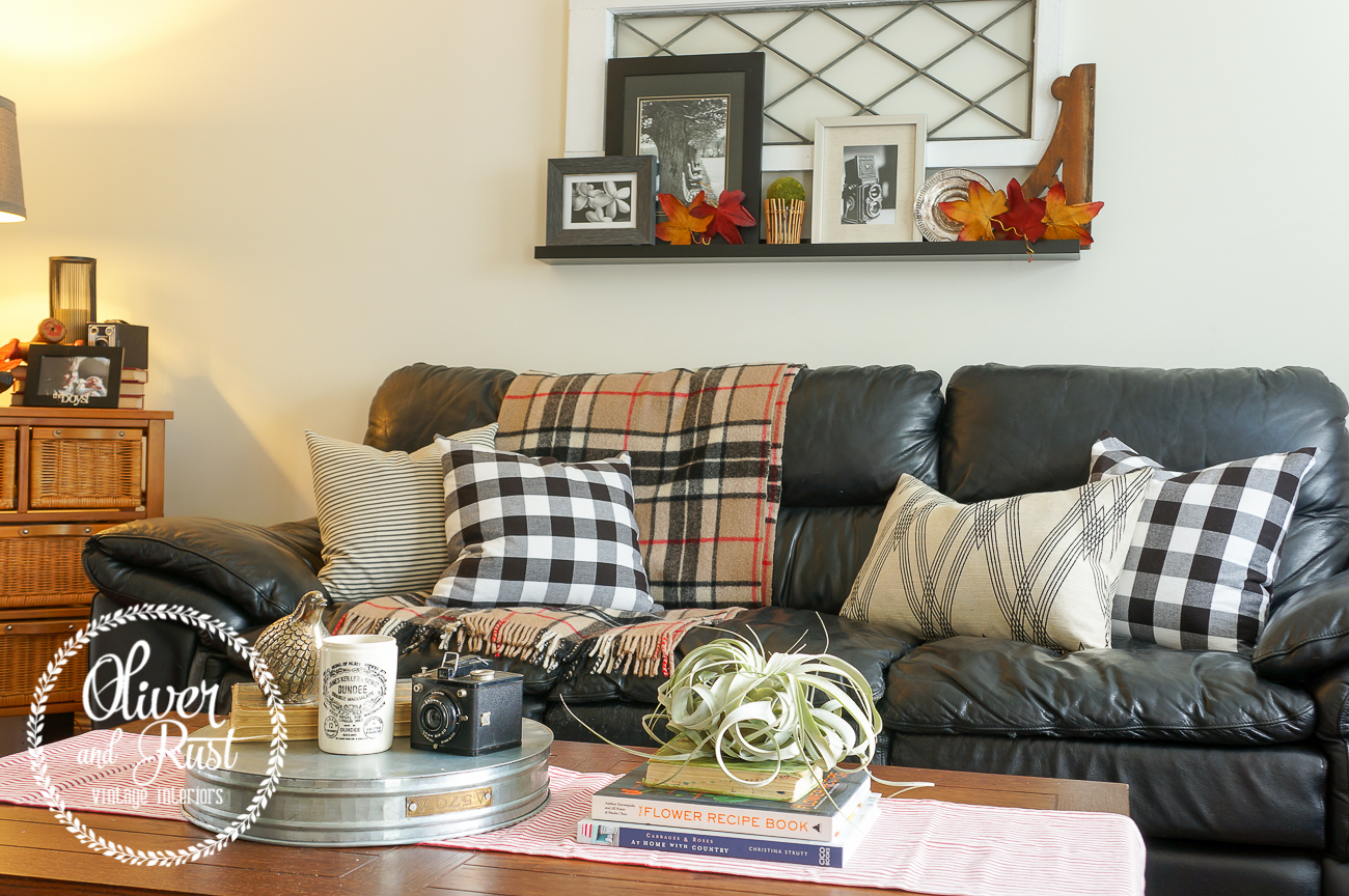 traditional black and white buffalo check fabric as well as ticking stripe, a burberry style wool throw complete this look.