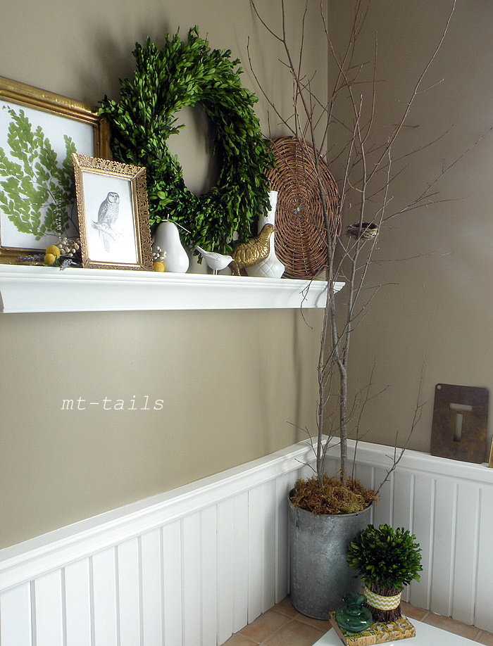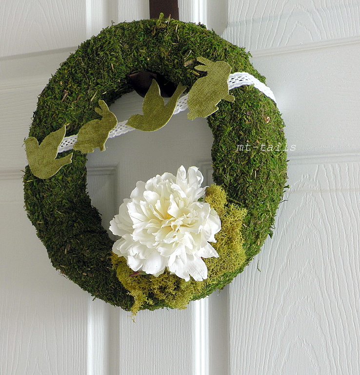 i also made a moss wreath for our bathroom door. i'm still not totally convinced about the bird, bunny bunting but it's growing on me.
