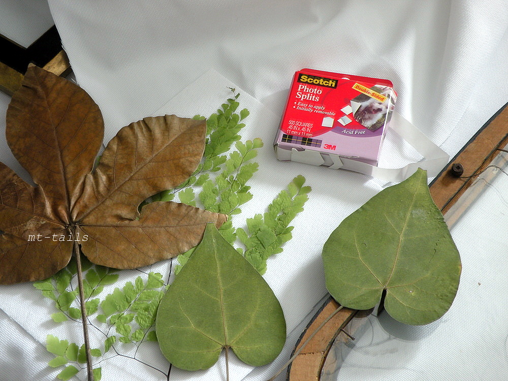 I used scrapbooking photo splits to attach the leaves to the fabric. They are double sided tiny squares and hold without tearing the leaves if you put them in the wrong spot the first time.