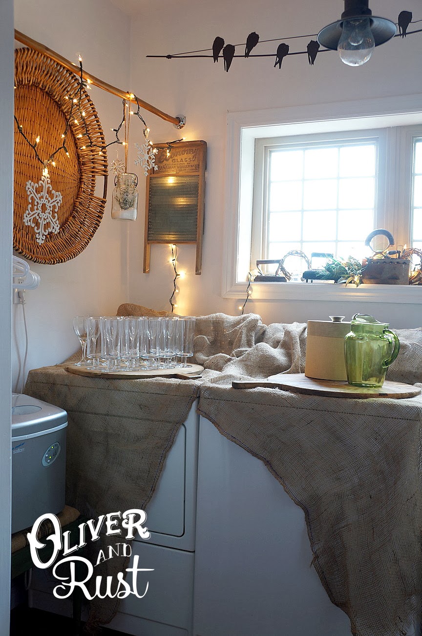 we are able to remove the doors from our laundry room and turn our washer and dryer into a bar. we have all of the glassware, ice buckets, ice machine, buckets of drinks, openers etc laid out and easily accessible for people to be served and help themselves. a simple table against a wall can achieve this just as well.