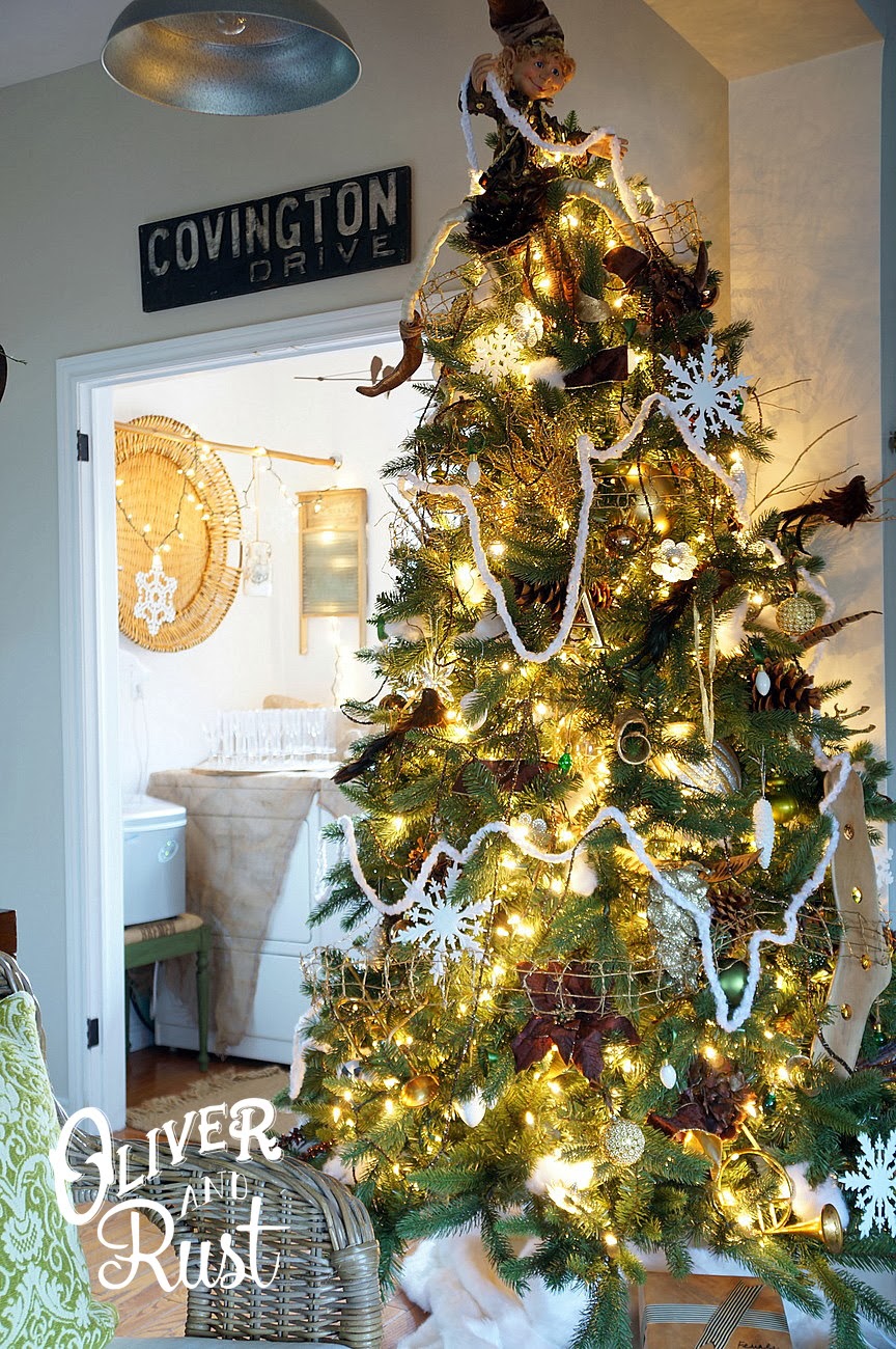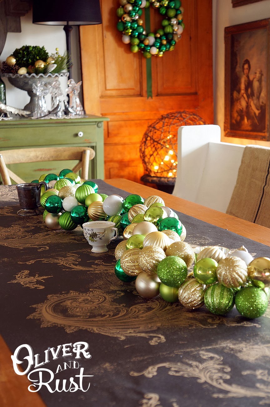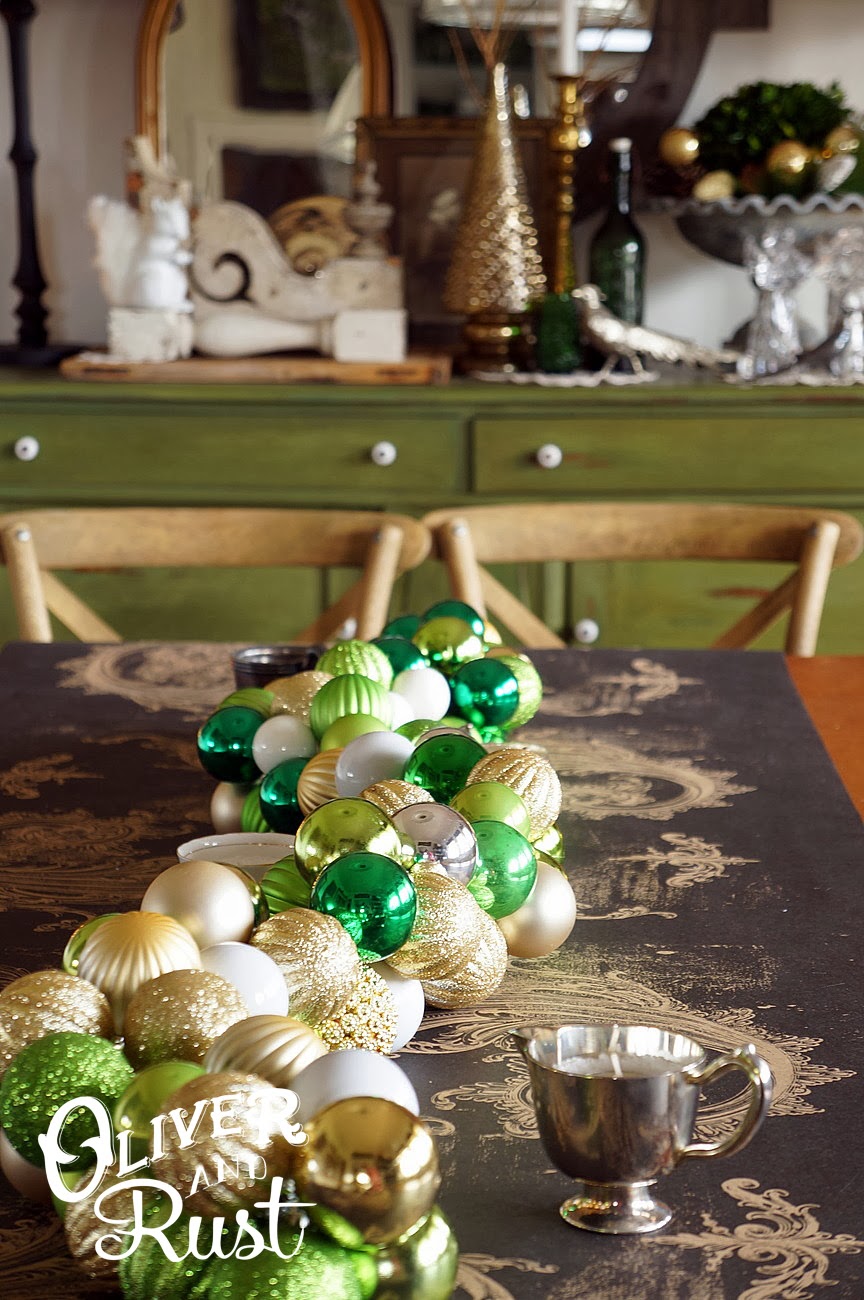 our table needed to seat at least 11 people and then others were scattered around the main floor. not ideal but we don't have a spare dining table for the once a year huge sit down meal. in the dining room i removed our regular antique grainsack table runner to prevent ruin and added a fancy paper runner by kitchen papers. it looks great and can just go in the recycling when done. i removed our regular large table arrangement and made a skinny ornament chain to run down the center of the table. it lacks height allowing conversation flow and isn't too wide allowing people to pass and share food.