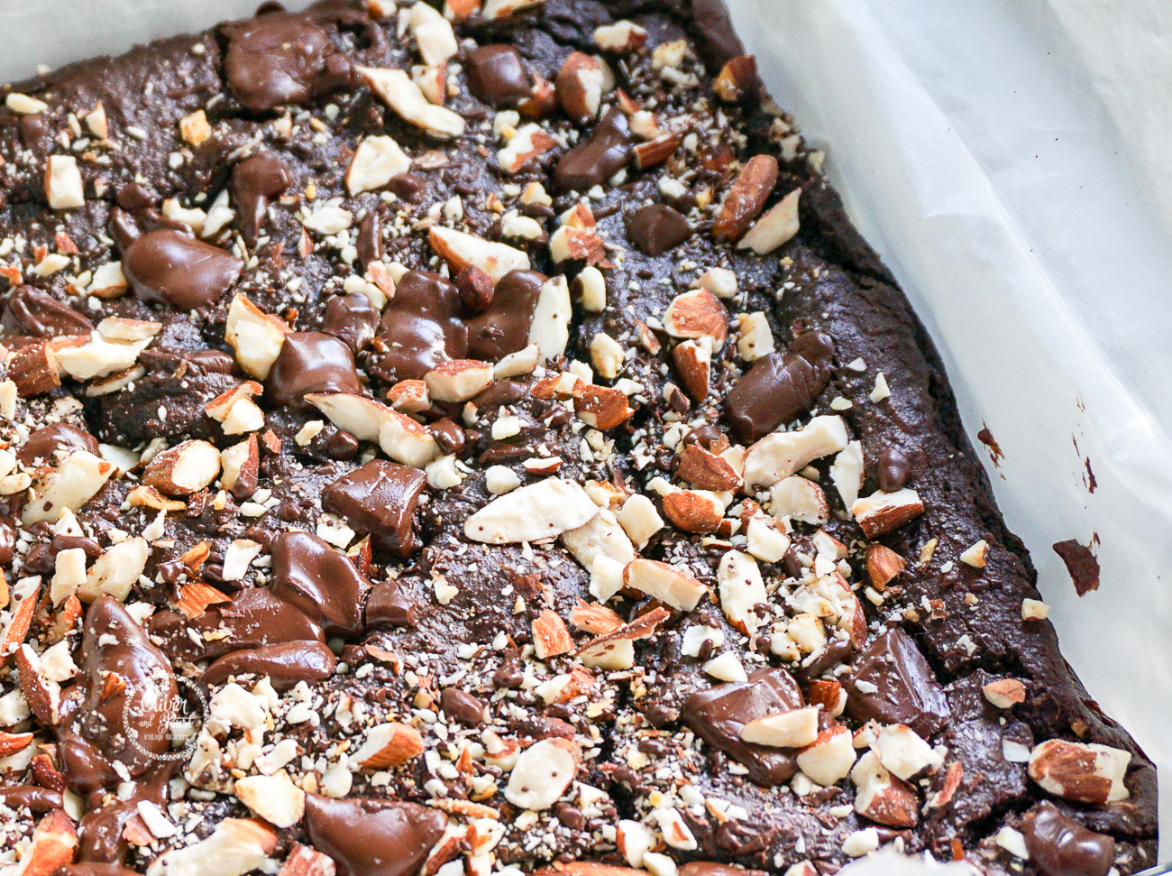 Bake for 25-30 minutes until the brownies are firm, and lightly cracked on top.