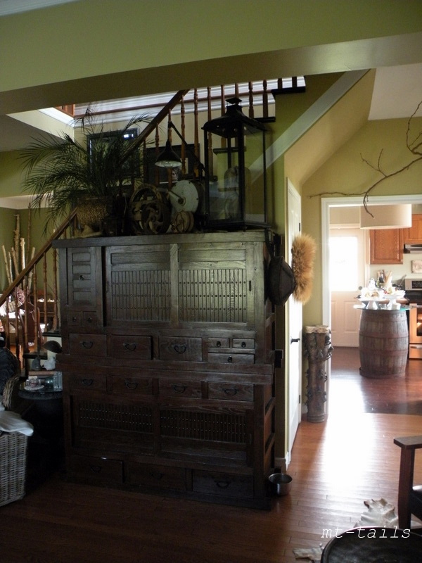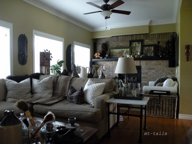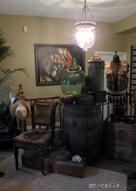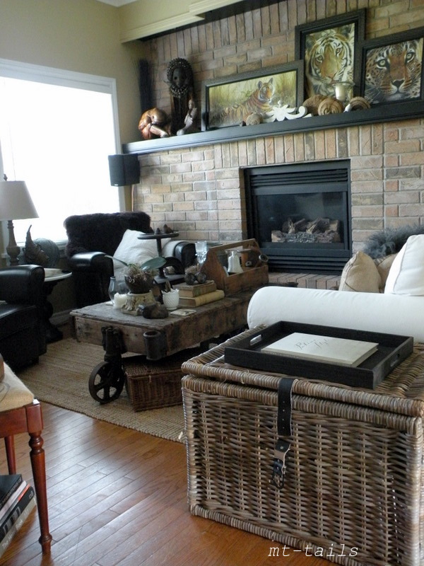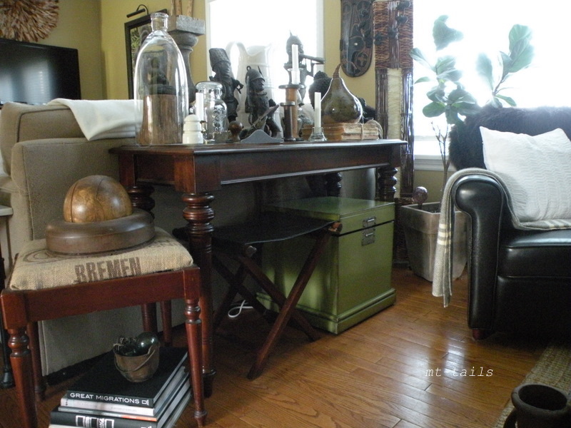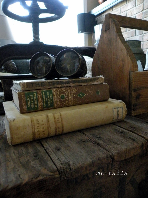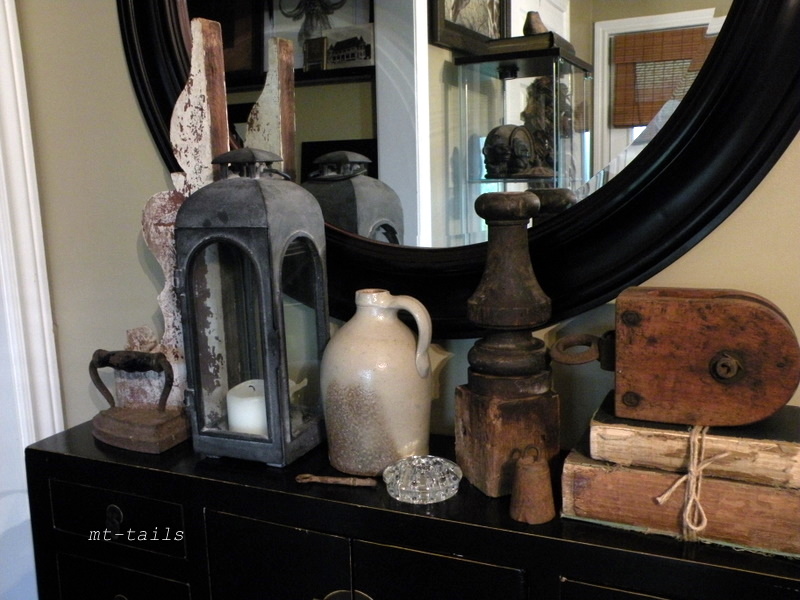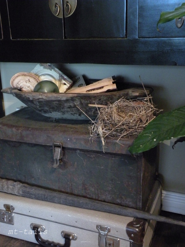 the basket is a ZULU basket from South Africa, the cigarette piece is my photo in a Pottery Barn frame. antique corbel, birds nest, gold mailbox door, vellum books(new collection for me). the black lantern is Restoration Hardware iron.