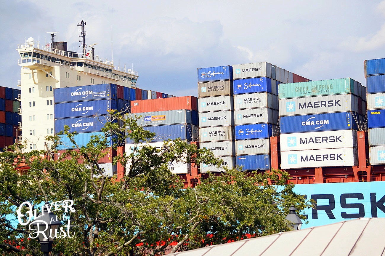 We had lunch down on River St which looks right out onto...yep you guessed it, the river and Savannah's shipping harbour. I got a few shots of a huge tanker with a lot of cargo going through. It was really neat, even though we leave near the Welland Canal, I love watching the boats.