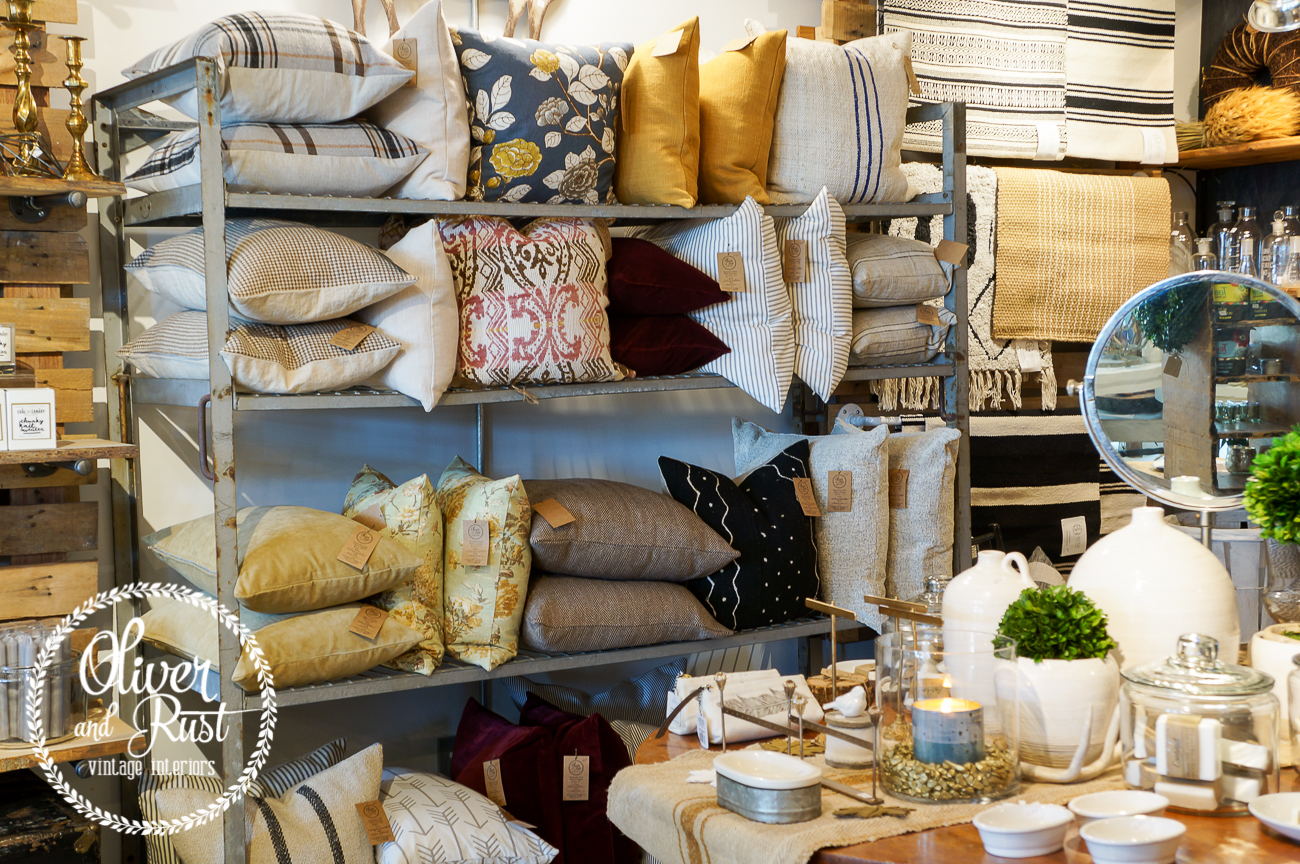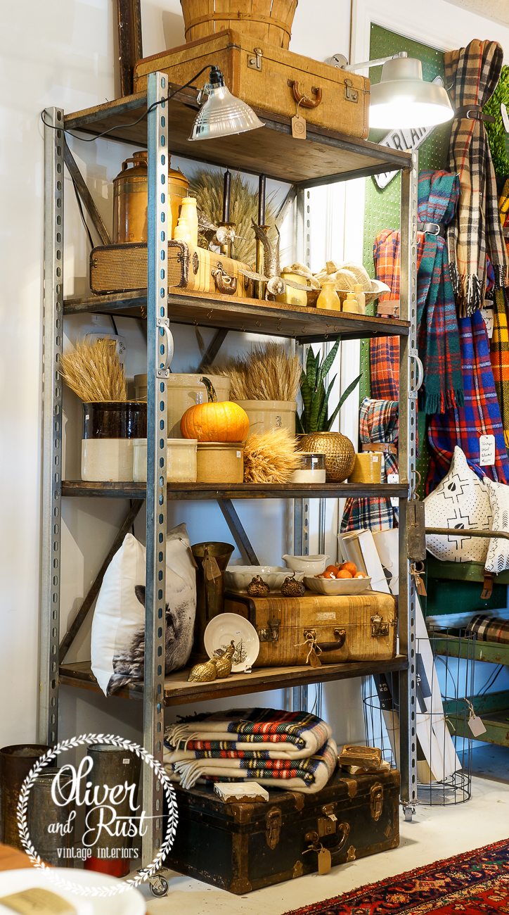the massive pipe shelf dressed in autumn, with a huge boatload of new custom pillows, vintage, gold, wheat, you name it. and the newly utilized pegboard wall of tartan finery. there are quite a few vintage right now as i am awaiting my order of new tartan from scotland. all ready to snuggle with and completely washable.