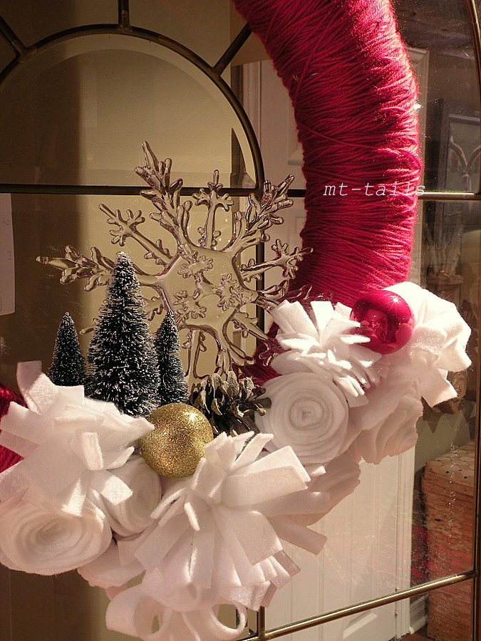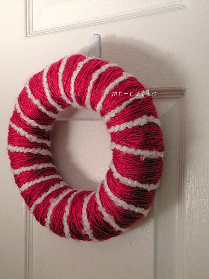 once you finish wrapping the red, grab a thick wooly looking white yarn and do regular intervals around the wreath to give it a stripey appeal. done. easy right?