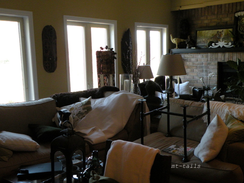 my living room now looks like this. utter beautiful chaos. yup that's also my dog getting comfy in her soon to be gone sectional (replaced with an ikea white slipcover sectional. our current couch was disappointing for the money and quality of cushions.)