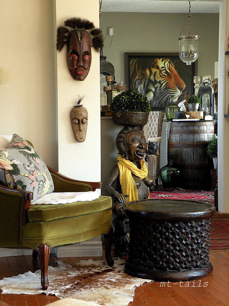 It captured this mossy green chair and my african statue and travelled into the front hall with the hurricane lantern and one of our collection of tiger paintings by Edward Spera.
