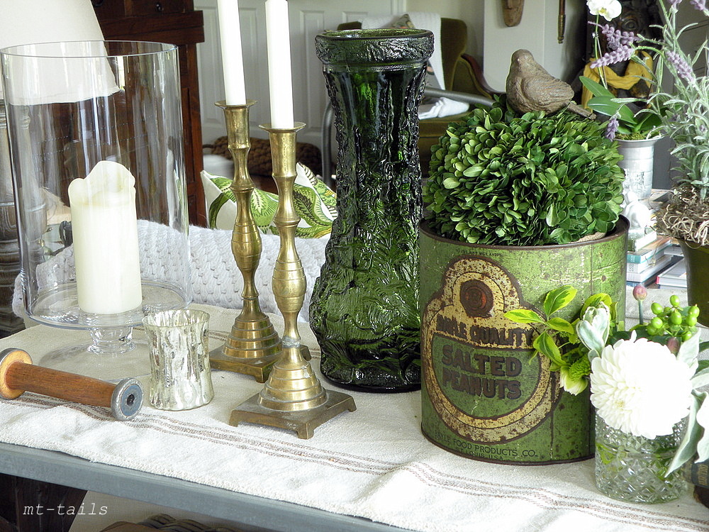 I popped the boxwood that was sitting here inside the can and moved around the items on top of the console table. I found the gnarly huge green vase at the Goodwill. I can imagine in some settings it may seem quite tacky but the colour was just perfect and I think it is more quirky than tacky. Kind of like Kirk.