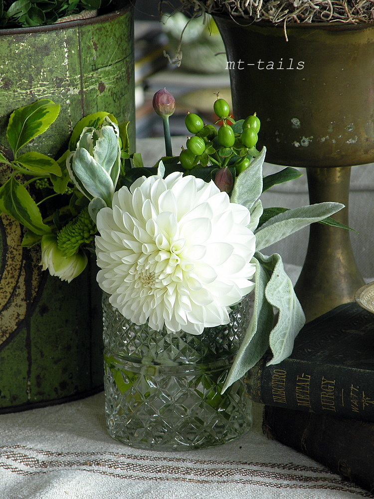 a little flower arrangement i update from the garden every once in awhile in an old crystal tumbler