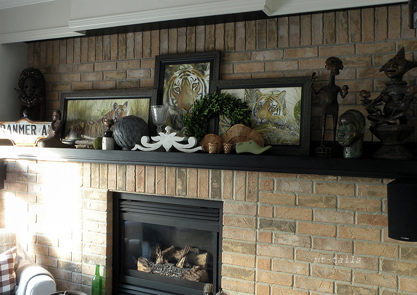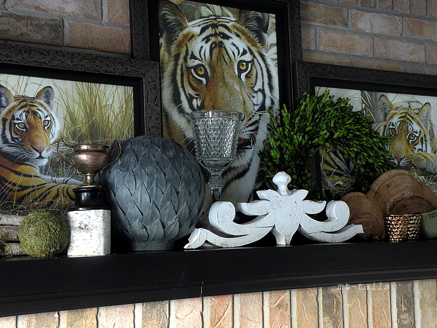 it was a challenge to get the right mix of nature, and vintage to blend in with my tigers. i pulled up one of the preserved boxwood wreaths to add some green. the green shoe form is an addition to my collection from a few months ago, and a few will be available in my etsy shop when i re-open (hopefully tomorrow)