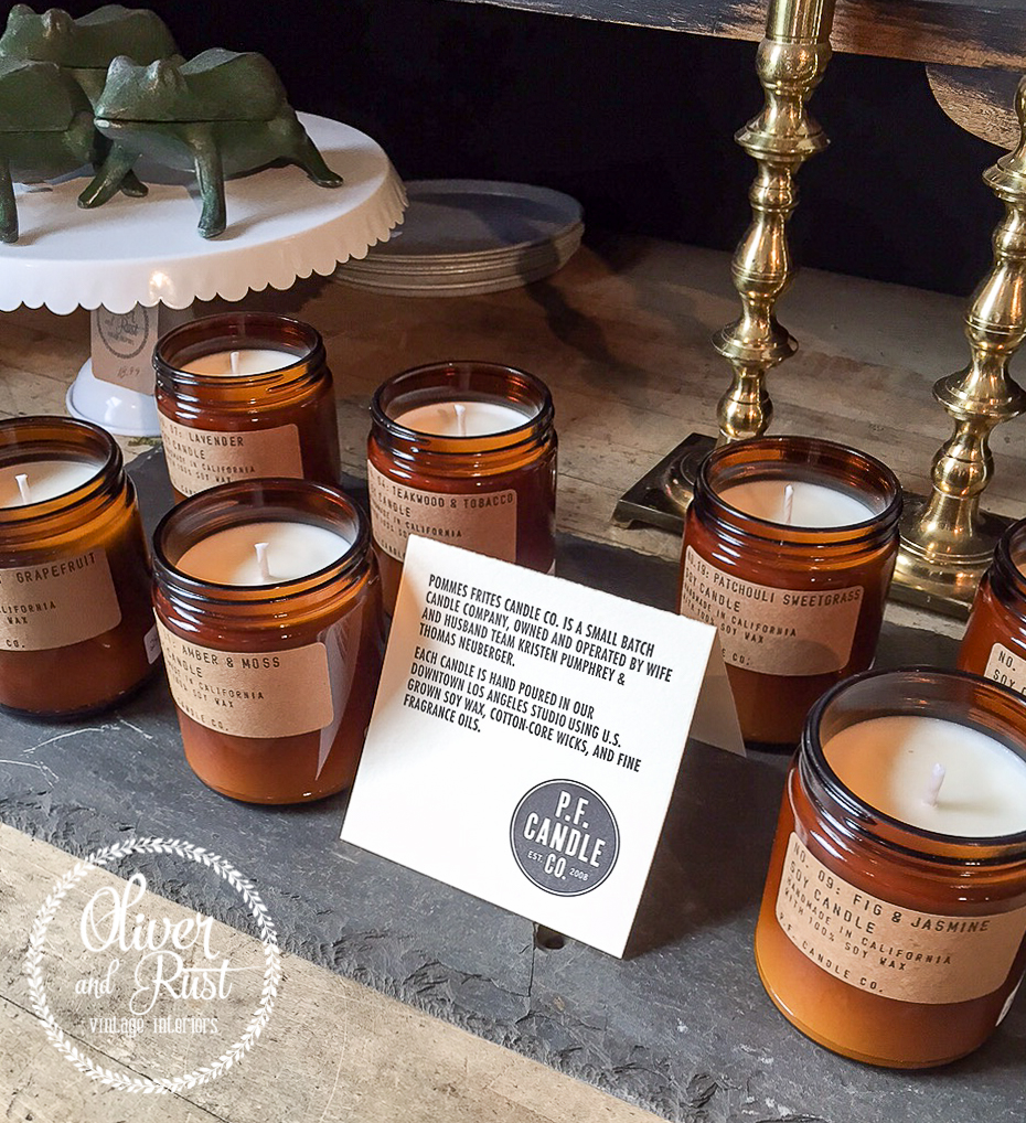 Our new smelling station for our #pfcandleco line. They have screw on lids which look fantastic but in the shop with so many choices, the lids inhibit people from really getting a good sniff of each of these beauties.