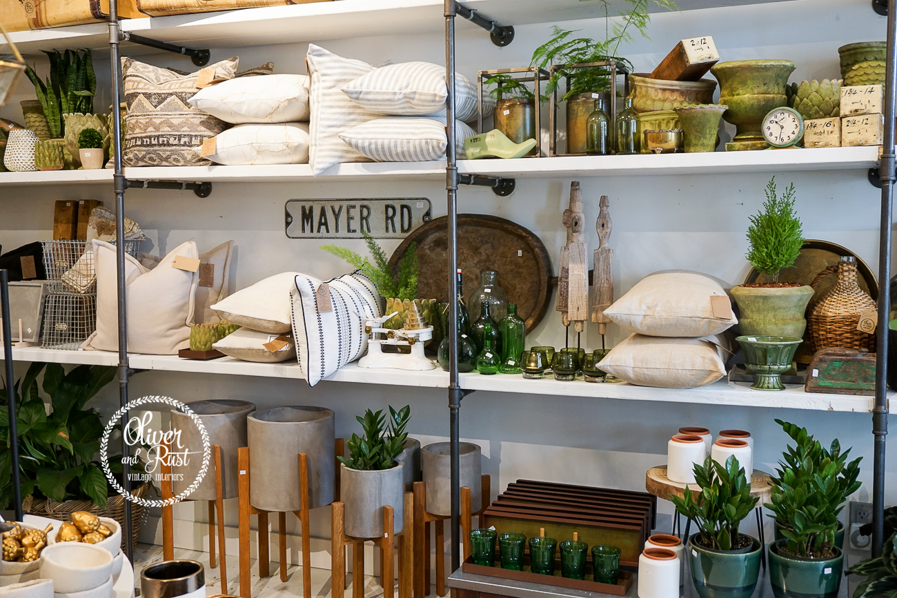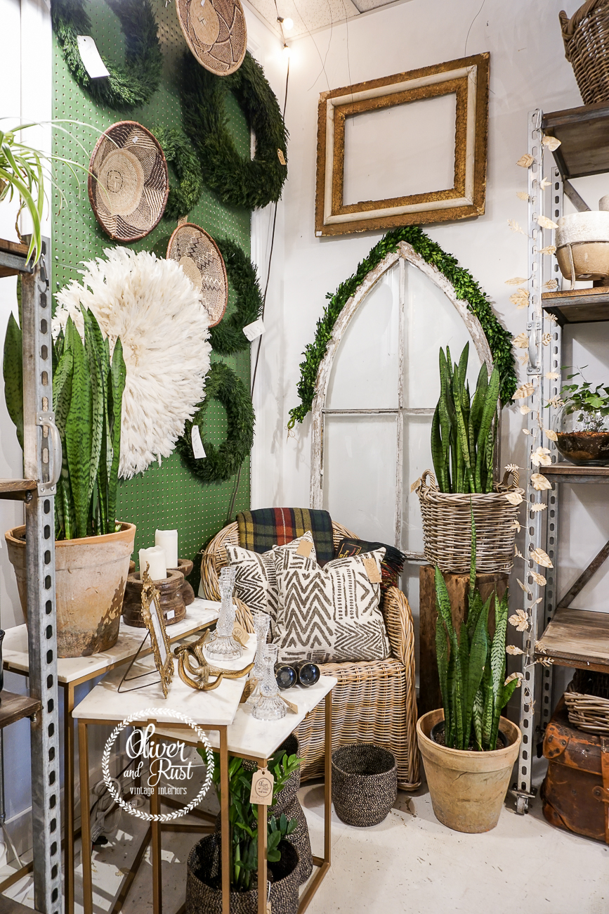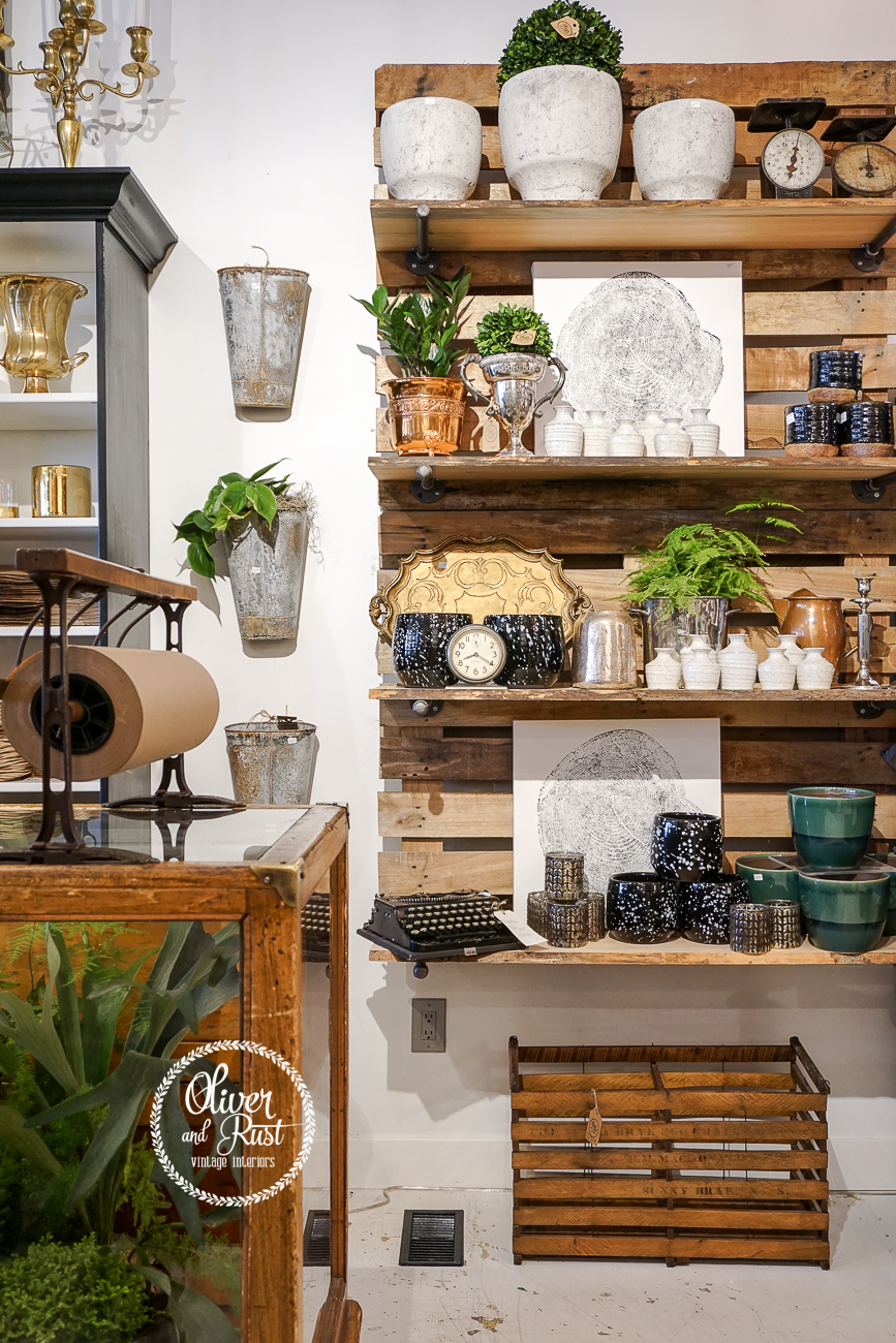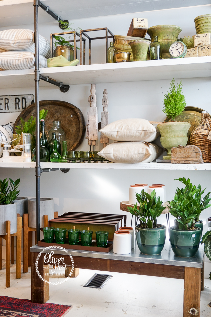 I saved this photo for last. It's a wide angle view of a good portion of the front of the store. It encompasses everything about how I want my store to speak to people when they come in. We have plants, pots, vintage and new, a bit of eclectic and a bit of polish. There's rough and refined and it's blended together to help you think outside your comfort zone and find that perfect piece for your home. Because being at home in YOUR home is what I'm selling. The idea of comfort, the feeling of pride and making your space work for your life.