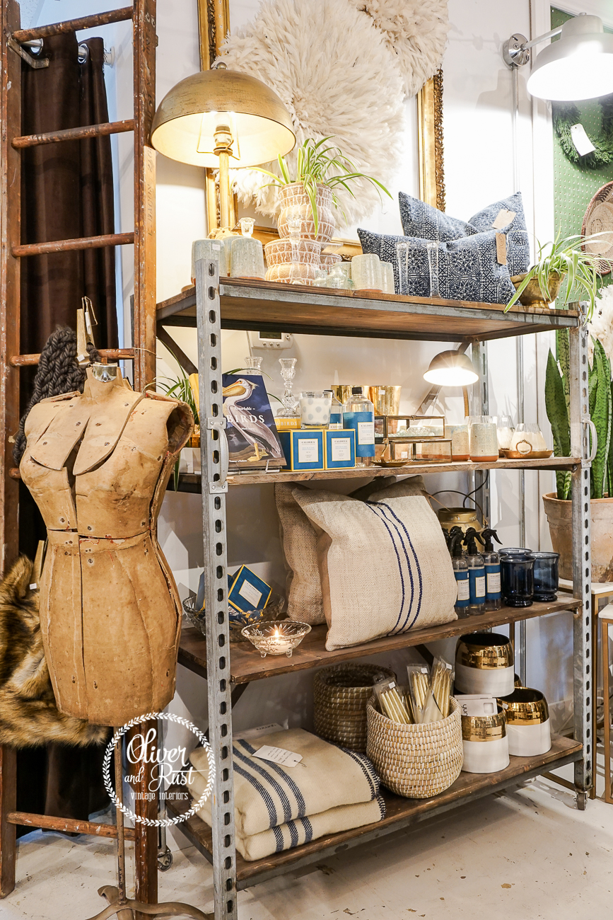 The back corner of the shop ended up with a focus on blue, white, copper and silvers. Much of the blue went away for the Christmas season so the shop would "vibe" but it feels fresh to bring it back out. A few of the new chinoiserie style pieces on the back wall are new pieces but still hand painted and they are gorgeous.