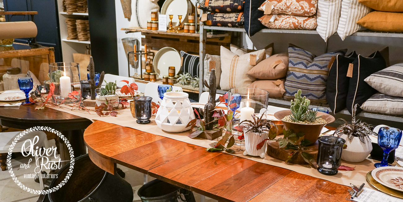 Nothing like a little dirt on your hands and some good food to help you enjoy an evening of fun. Last night the store hosted it's first "new" style workshop to amazing success. The theme of the evening was Southwest Desert: the art of raising cacti and succulents. Below is the table setup in the shop prior to guests arriving and I realize at the end of the night I didn't get a shot of the food because we were too busy eating the churro chips with fruit salsa and black lager chicken flautas to take any photos of it. I did however get a bunch of good shots of the tablescape to share with you and the take home planters our guest received as they finished off the night.