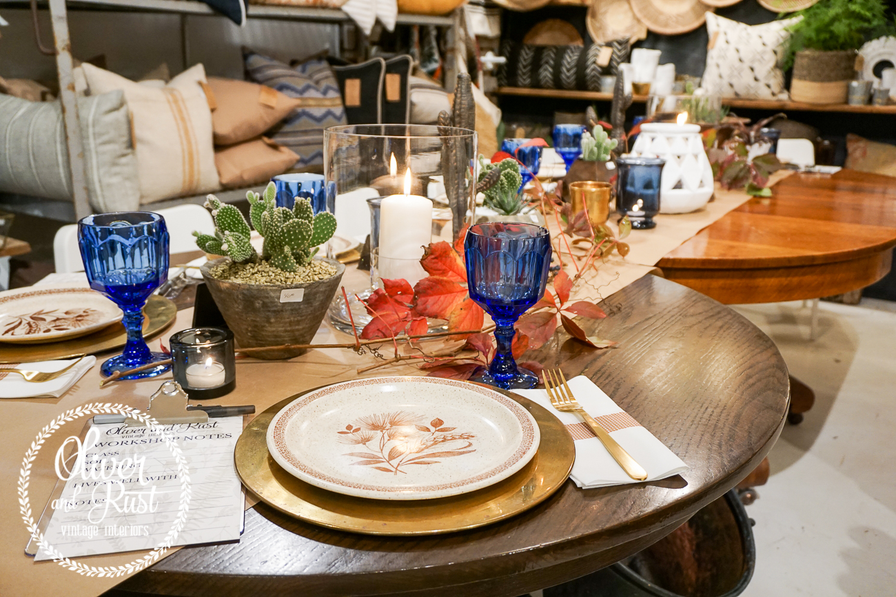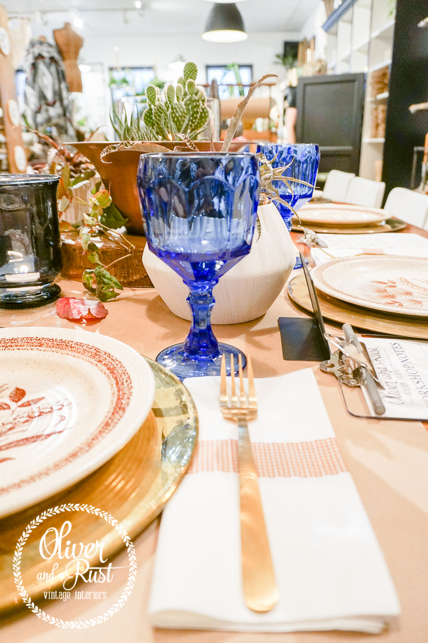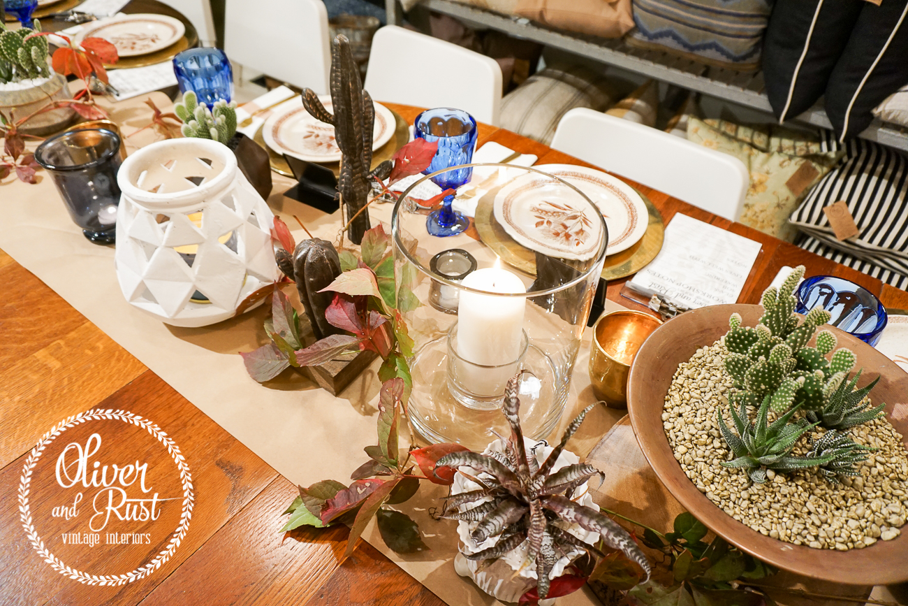 The table was set in all blue and gold tones with a touch of copper. Cactus planters, candles and a little fall nature add the final touch.