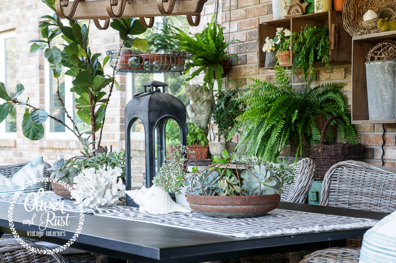 i change up the table items every year just a smidge so it seems different. this year i used old chicken feeders as succulent planters that don't require a lot of watering. i plopped some resin coral and regular sea shells amongst the lantern and called it done. the table runner is actually a floor runner we carried in the shop (i think there may be 1 left as of this writing) and i like that the weight is heavier than a normal table runner so it doesn't fly away.