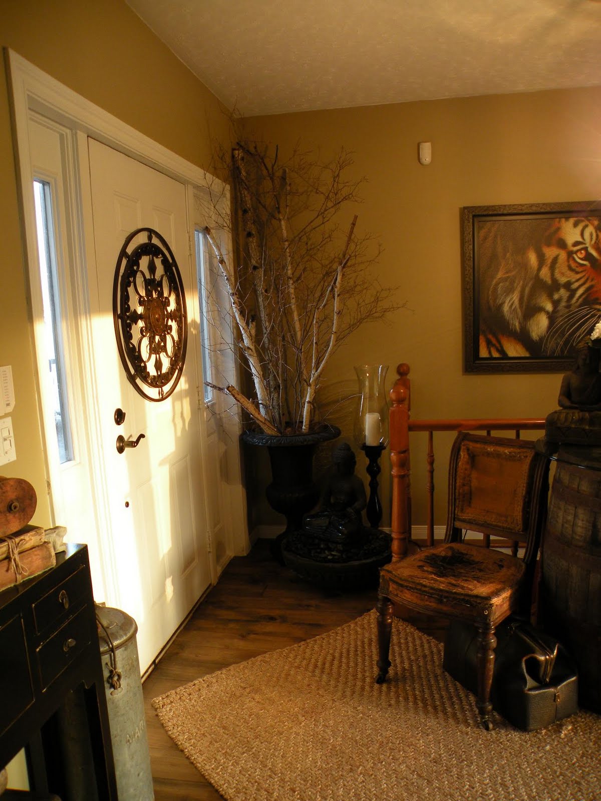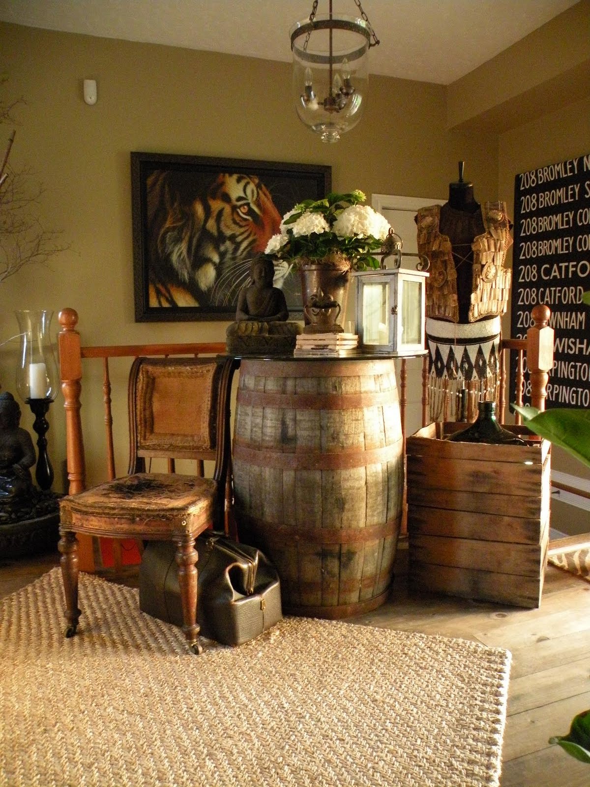 wine barrel foyer table. tiger painting in the background is an Edward Spera "Into the Light"