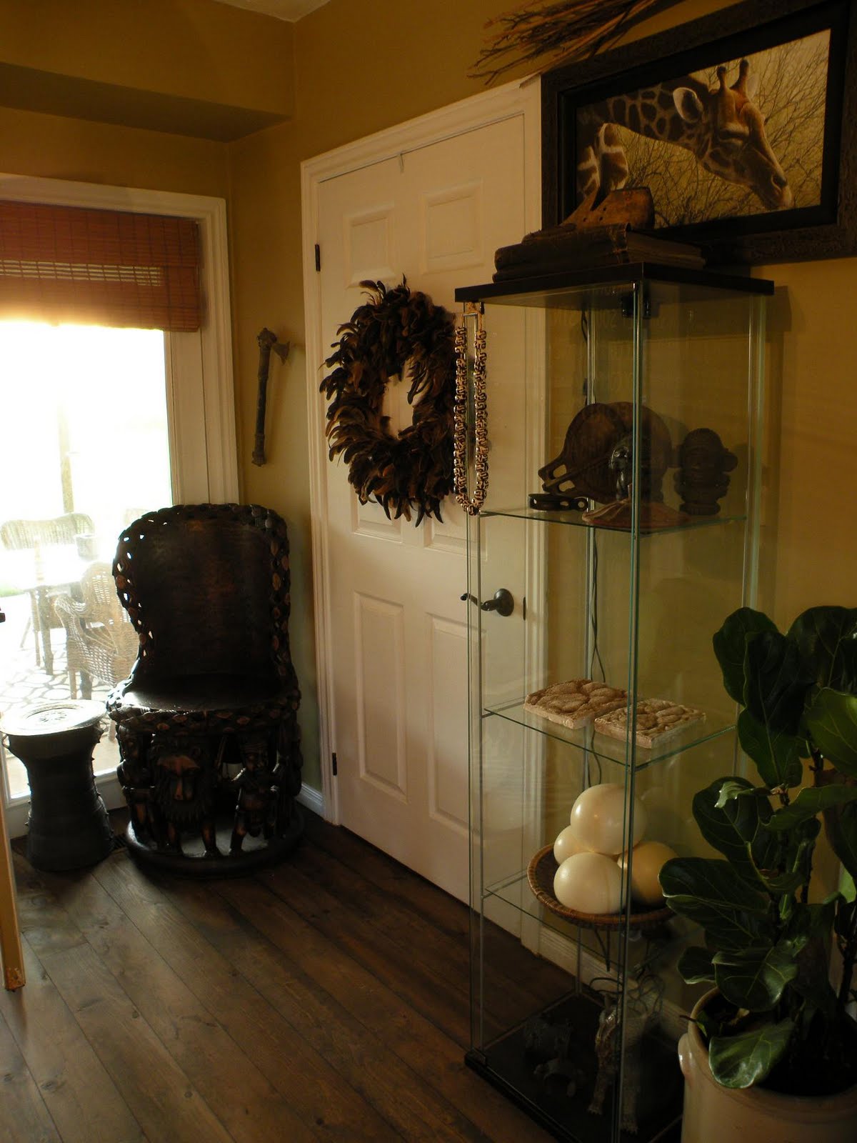 The Ikea glass cabinet holds a few of our travel finds and some rustic pulleys for display. The giraffe painting above the cabinet is an Edward Spera "Amongst the Thorns"original tyvek bus sign purchased on Etsy