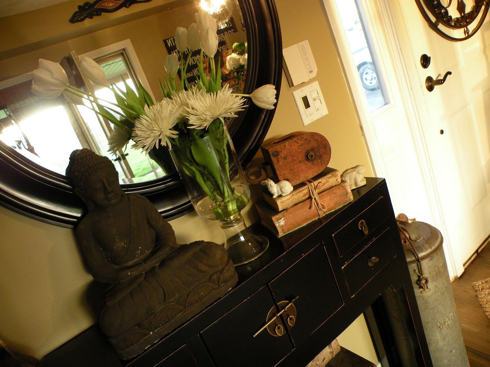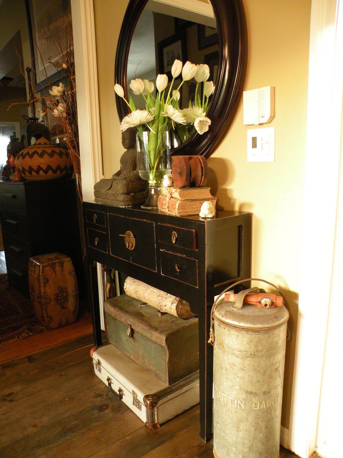 front table and mirror. the green toolbox was in Trevor's family and the cream can was found at a local antique store from a local farm.