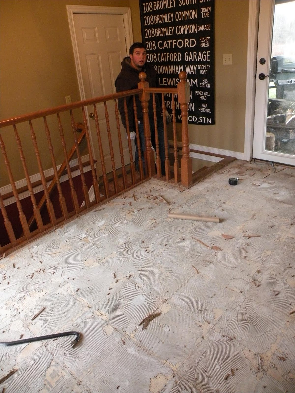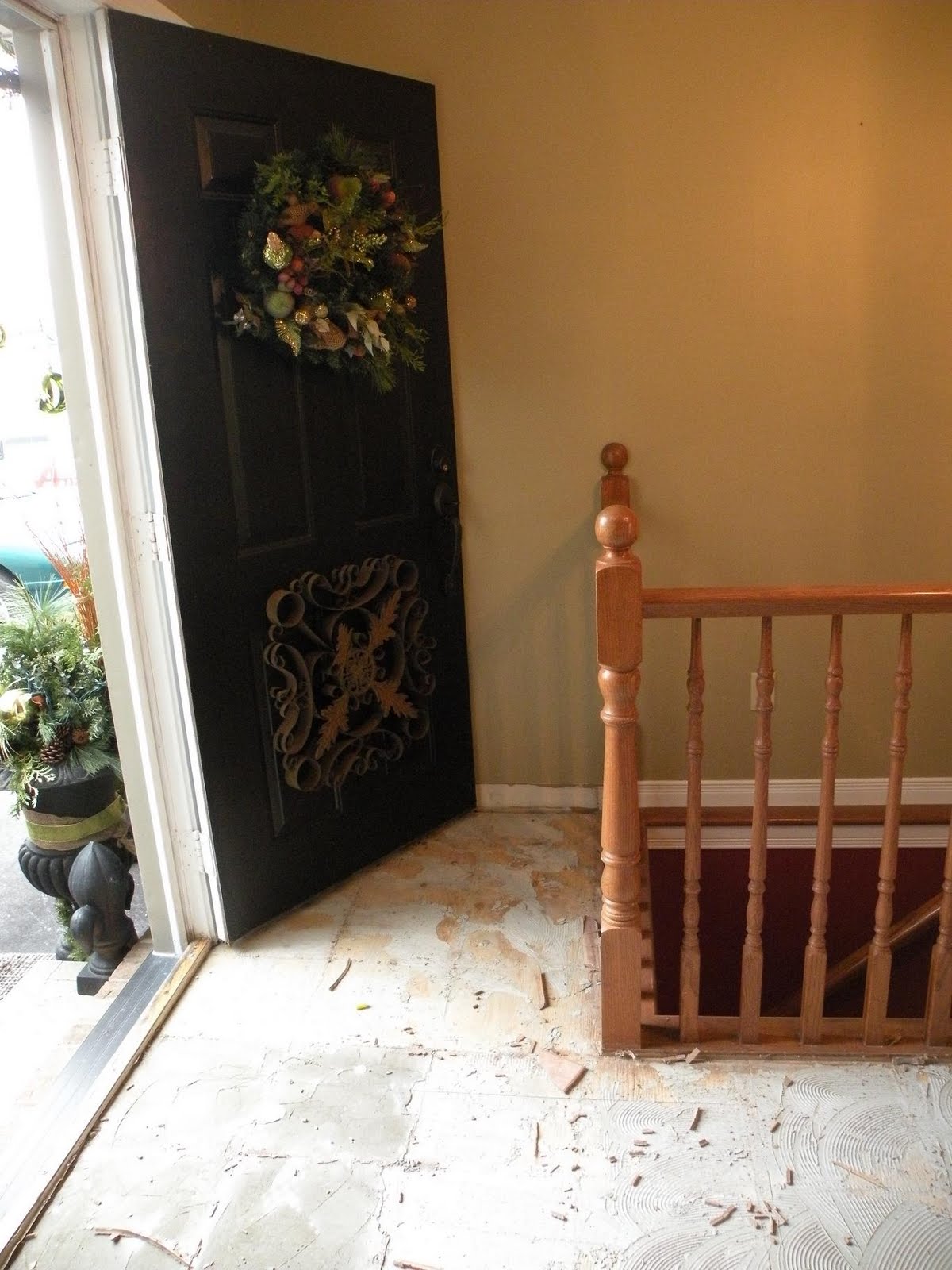 Last fall, our renovation adventures took us to ripping up an uneven and peachy tile floor in our front hall. The decision was tossing between tile and wood and the wide plank wood floors won out.