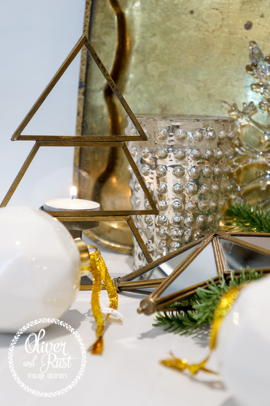 a] white geometric christmas ornaments, b] simple glass tealight holder, c] mercury glass votive holders, d] mirrored antique star ornament, e] acrylic snowflake various sizes, f] illume winter white candle, g] flocked brown deer decoration, h] glass pinecone ornaments, i] simple geometric pot doubling as a votive holder or plant holder