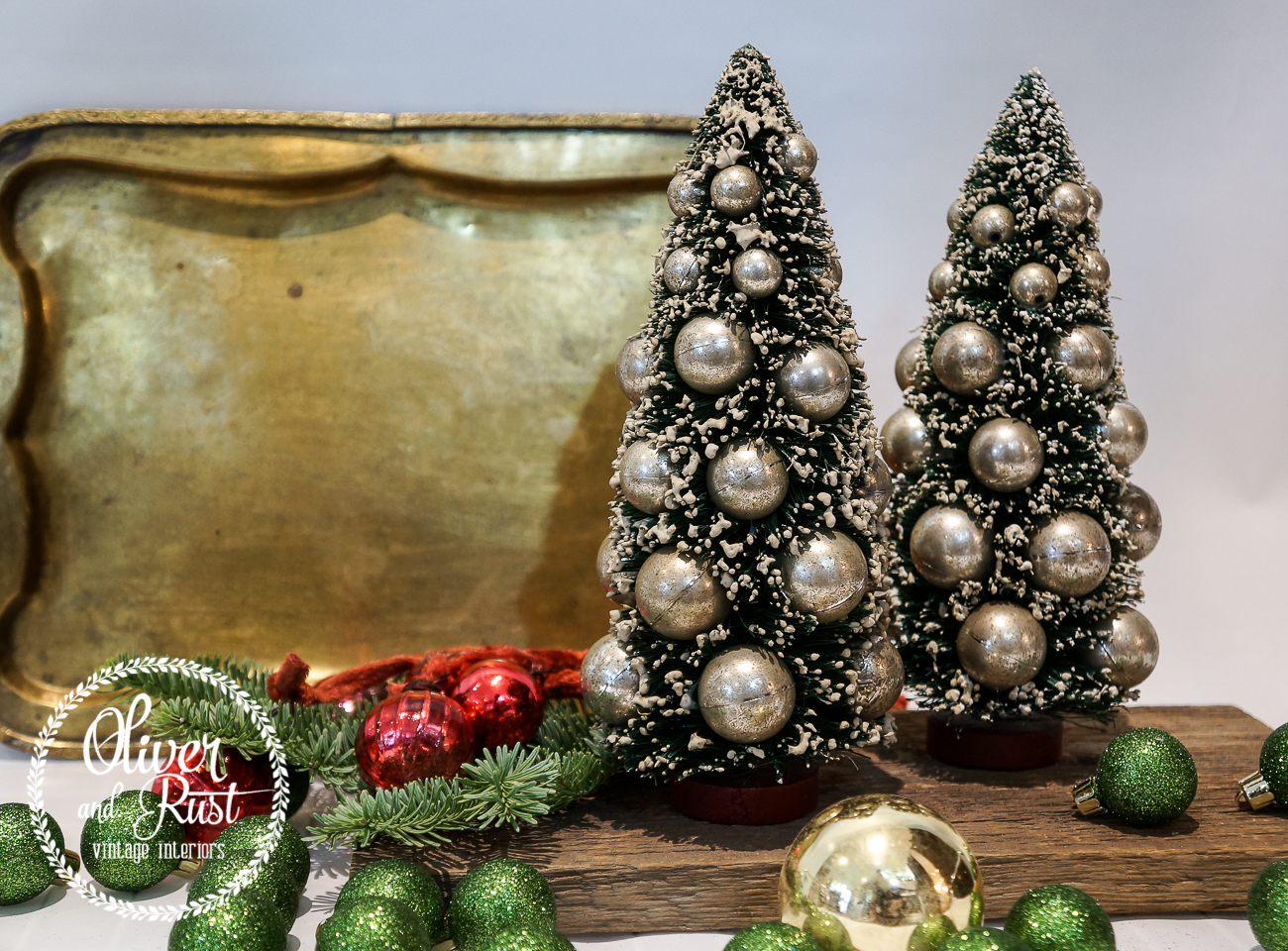 a] vintage red cone ornaments b]handmade wooden block decor with vintage santa holiday card motif c] antique brass tray d] reproduction lovely bottle brush tree e] lab beaker f] pewter measuring pitchers g] vintage silver deer h] bottle brush wreath ornament i] handmade pottery mug j] provisions food items k] vintage style role poly santa m] brass candlesticks