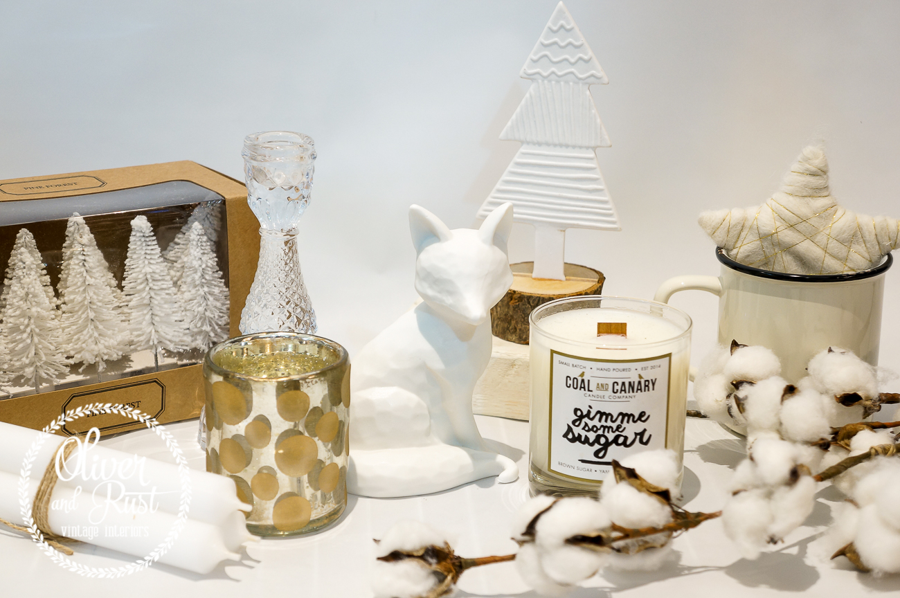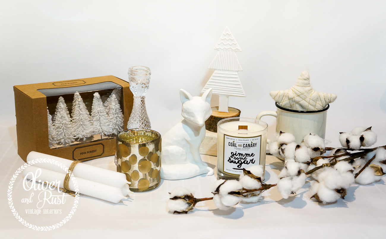 a]a white tree farm. b]classic glass taper holders c] white candlesticks c] white ceramic fox d] mercury glass votive older e] white scandinavian tree decoration f] canadian made coal and canary candle g] dishwasher microwave safe white or ivory mug set h] cotton branches i] yarn ornaments and decor