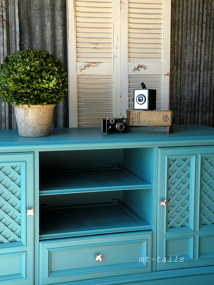 I have been working on a design project for someone I work with and have been helping her love her home again. Our styles are quite different so, it has been fun going sparkly and bright. She needed a new media center and desperately wanted it to be turquoise. The media centers out there are too big, too small or way too expensive (ridiculous really for what you get) I found this very unloved dresser at the thrift store and quickly went to work turning it into a Tiffany box.
