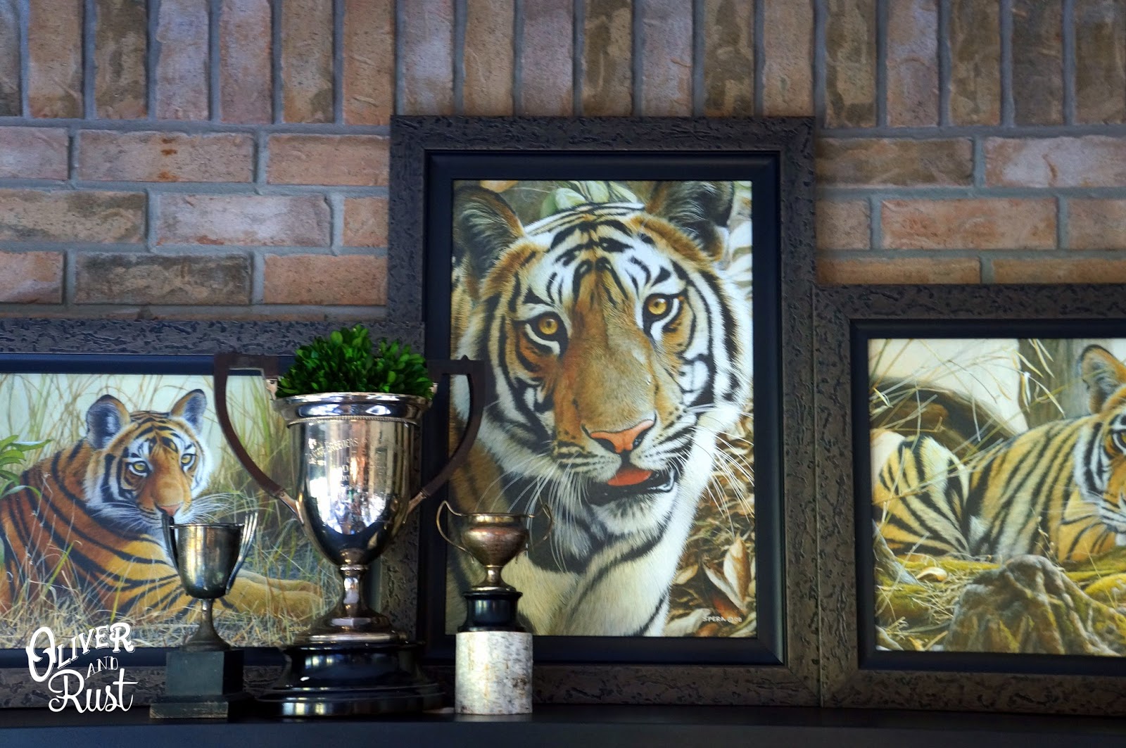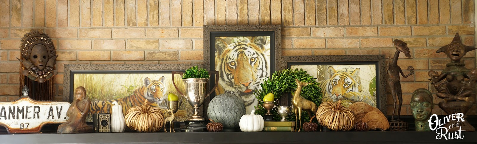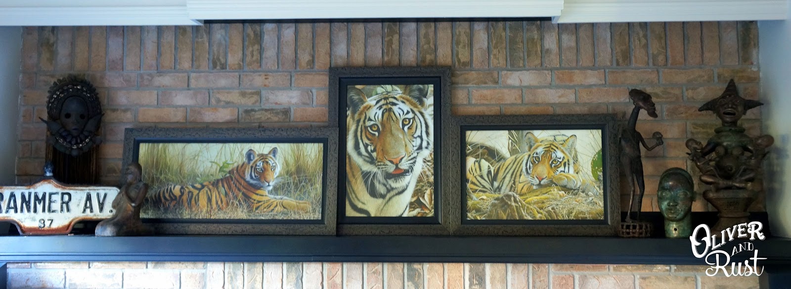our mantel is very large and stretches across the whole back wall of the living room. the main layout for the mantel is 3 sets of 3. i enjoy odd numbers of displays always finding them more pleasing to the eye. there are 3 of our edward speraa tiger paintings, 3 of our larger african bronze pieces on the right and the odd trio on the left; a dan racing mask, antique metal street sign and praying yogi