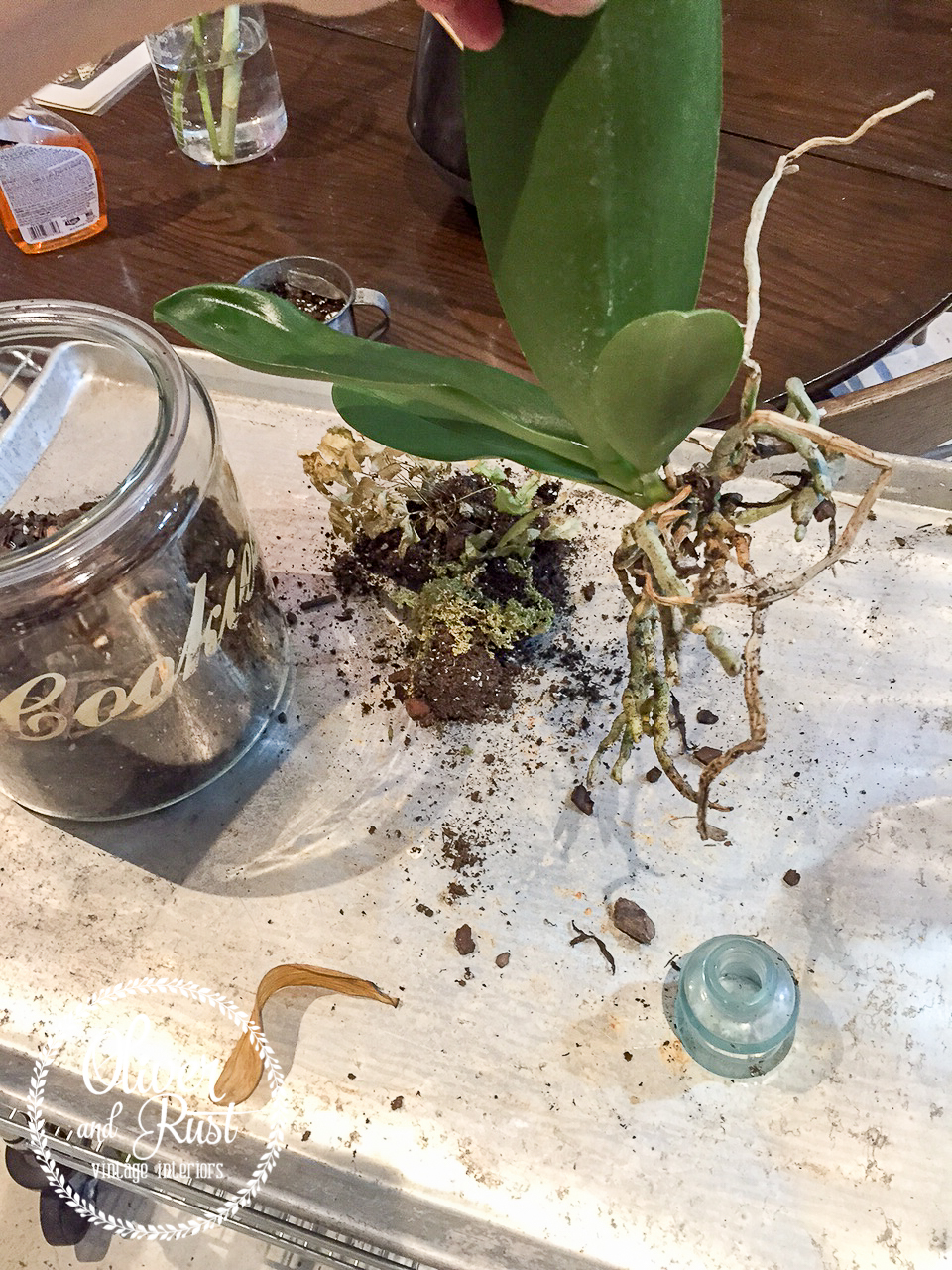 a vintage cookie jar that had been turned into a terrarium by yours truly with an orchid and 2 baby ferns. as you can see those ferns have taken on a lovely golden tone much like the colour of my lawn this summer. the orchid however seems quite happy. now to find out why?