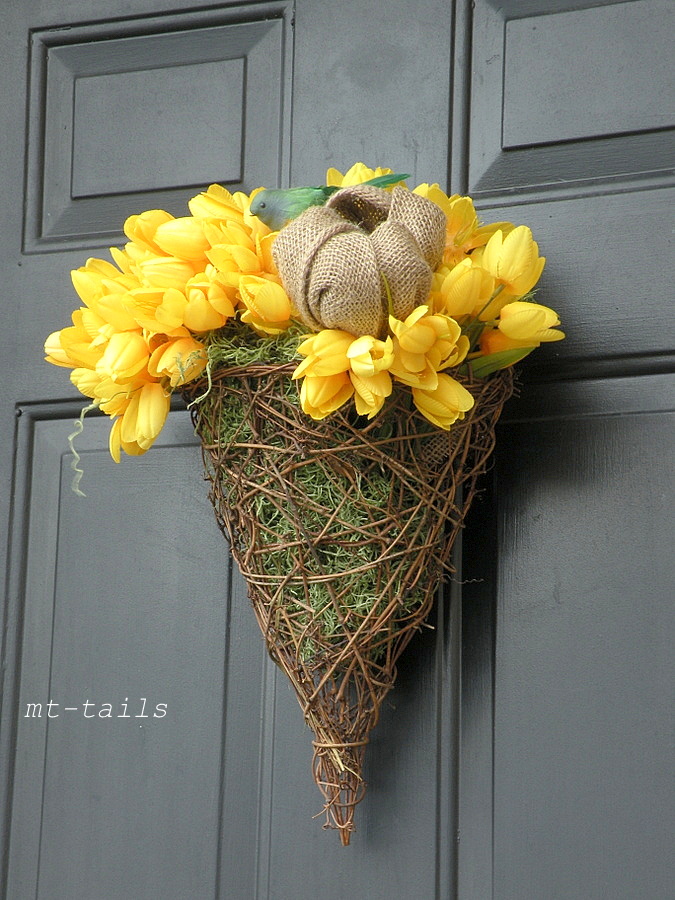 a very simple arrangement. basil spanish moss with loads of yellow tulips and the sweetest blue-green bird