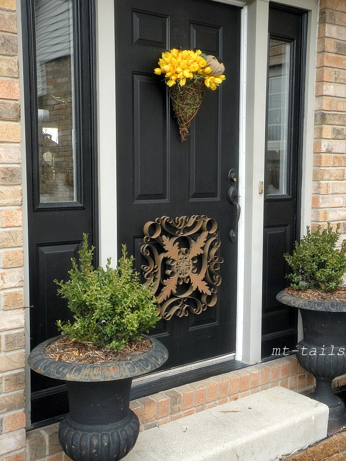 Our home lies next to a farmers field and the main door has no protection so our gale force winds in the spring, rainstorms and beating morning sun do a number on door arrangements year to year. Therefore, prerequisite of any door arrangement: CHEAP and NOT FRAGILE.