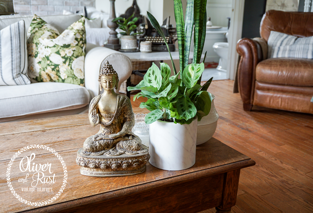 For my fellow plant lovers, the marble pot is planted with a prayer plant [maranta leuconeura], the plant behind is a snake plant