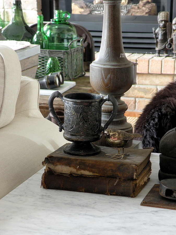 this cute handled silver cup makes a lovely candleholder. there is so much detail in the tarnish.