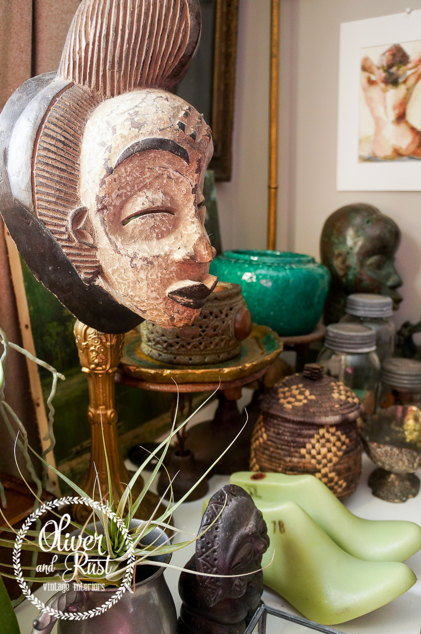 Collection center #1. I have had that mask for years and it has been in my closet so I used an old lamp base and mounted it on top. Plants, african basket, bronze cuffs, jars of spools, green shoe forms, moon goddess from a trip to the Dominican. It's all set out for me to enjoy.
