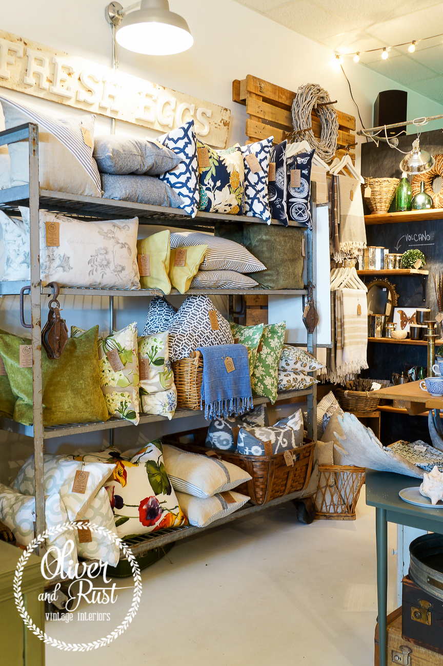 a good portion of the pillows are on this shelf. not all because lets face it, WE HAVE PILLOWS in the store in lots of shapes and colours because i am a fabric whore but this shelf is working it with more of them in one place