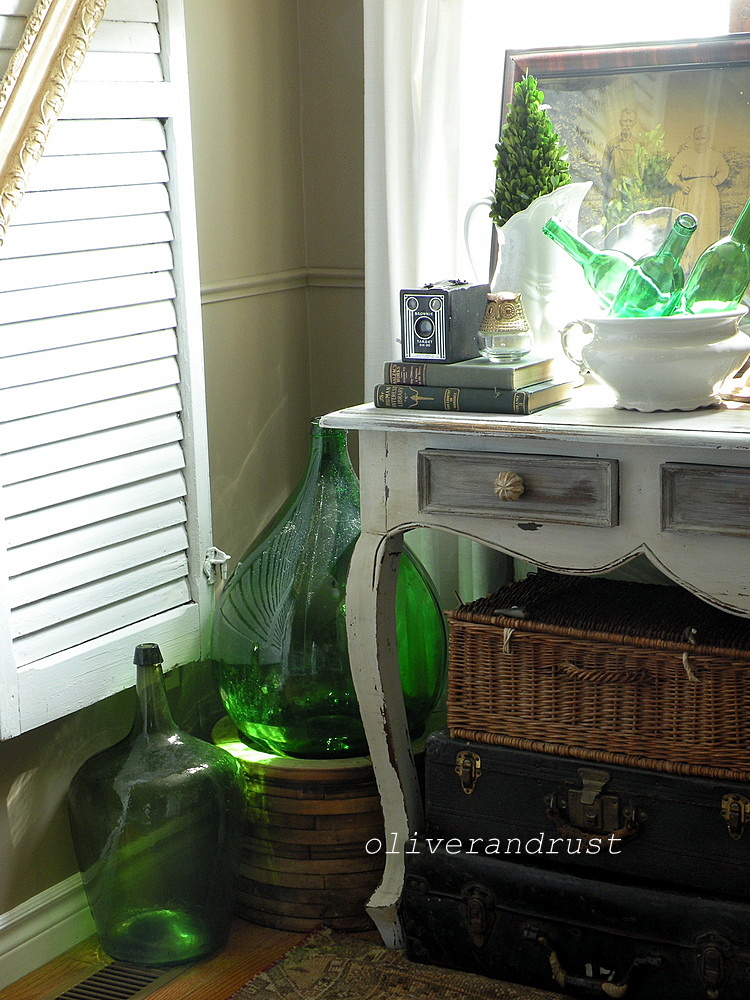 all styled up in the upstairs hall. lots of white and green mixed in with my industrial pulleys