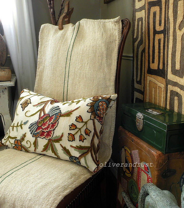 i love this leather chair that we got many years ago. it is very fall in its appearance though. i attached a light green striped grainsack to the chair with a wood hydro clamp. not permanent and gives the light look i was going for.